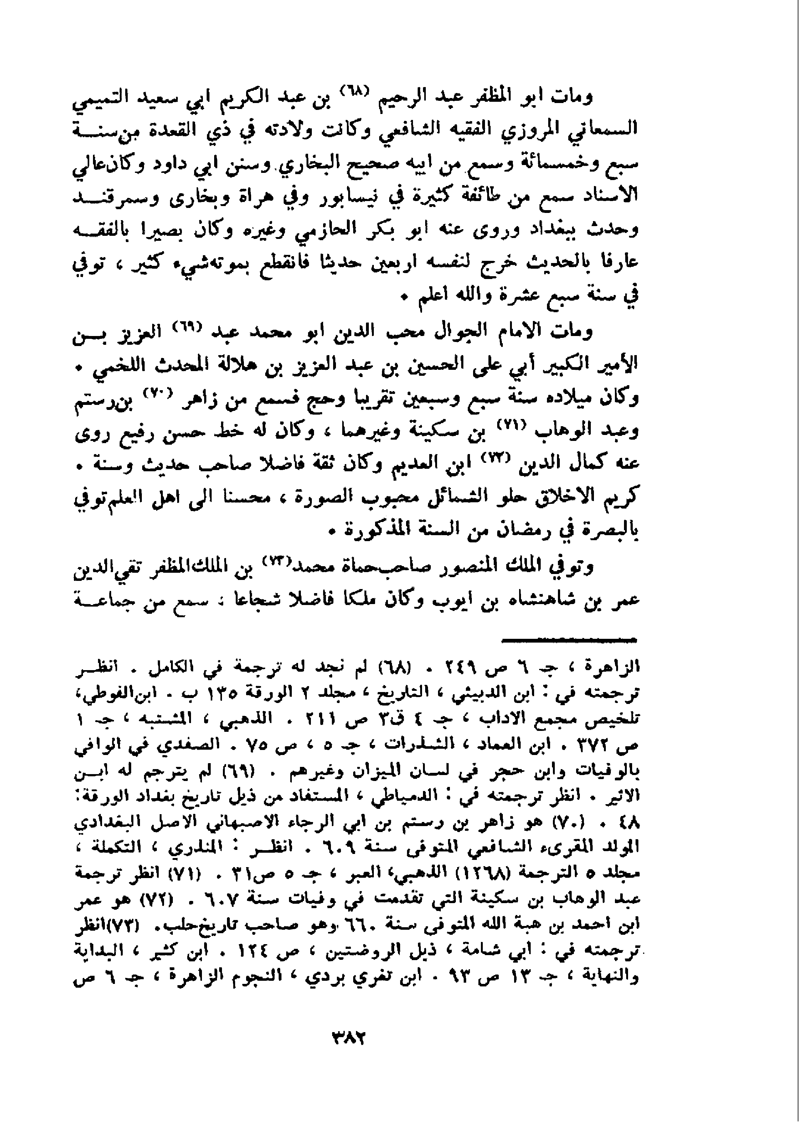 و كان ميلاده سنة سبع وسبعين تقريبا وحج فسمع من زاهر 70 بن رستم وعبد الوهاب 71 بن سكينة وغيرهما، وكان له خط حسن رفيع روى عنه كمال الدين 72 ابن العديم وكان ثقة فاضلا صاحب حديث وسنة.