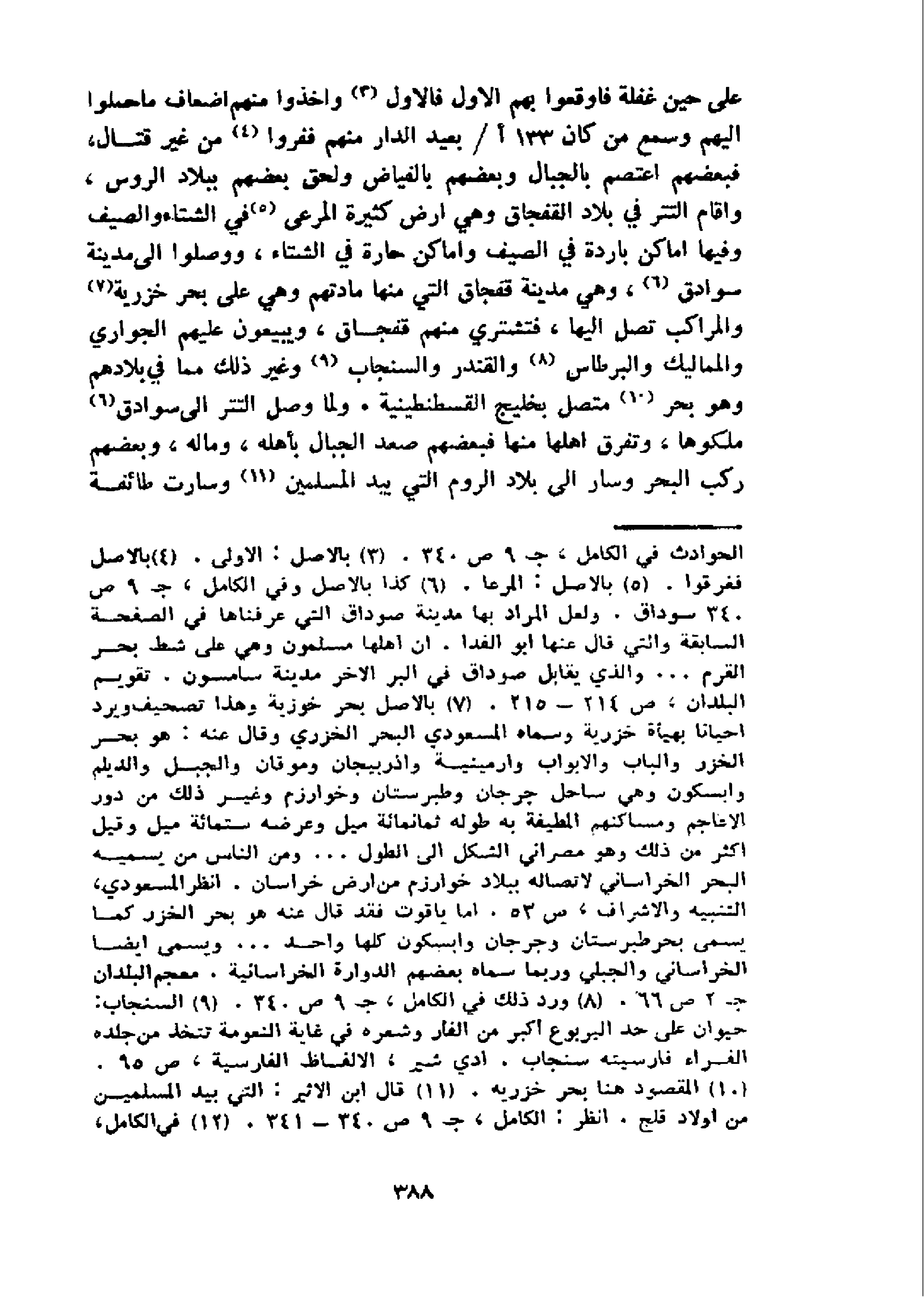 على حين غفلة فاوقعوا بهم الاول فالاول 3 و اخذوا منهم اضعاف ما حملوا اليهم وسمع من كان 133 أ/بعيد الدار منهم ففروا 4 من غير قتال، فبعضهم اعتصم بالجبال وبعضهم بالفياض ولحق بعضهم ببلاد الروس، واقام التتر في بلاد القفجاق وهي ارض كثيرة المرعى 5 في الشتاء والصيف وفيها اماكن باردة في الصيف واماكن حارة في الشتاء، ووصلوا الى مدينة سوادق 6، و هي مدينة قفجاق التي منها مادتهم وهي على بحر خزرية 7 و المراكب تصل اليها، فتشتري منهم قفجاق، ويبيعون عليهم الجواري والمماليك والبرطاس 8 و القندر والسنجاب 9 و غير ذلك مما في بلادهم وهو بحر 10 متصل بخليج القسطنطينية. ولما وصل التتر الى سوادق 6 ملكوها، وتفرق اهلها منها فبعضهم صعد الجبال بأهله، وماله، وبعضهم ركب البحر وسار الى بلاد الروم التي بيد المسلمين 11 و سارت طائفة