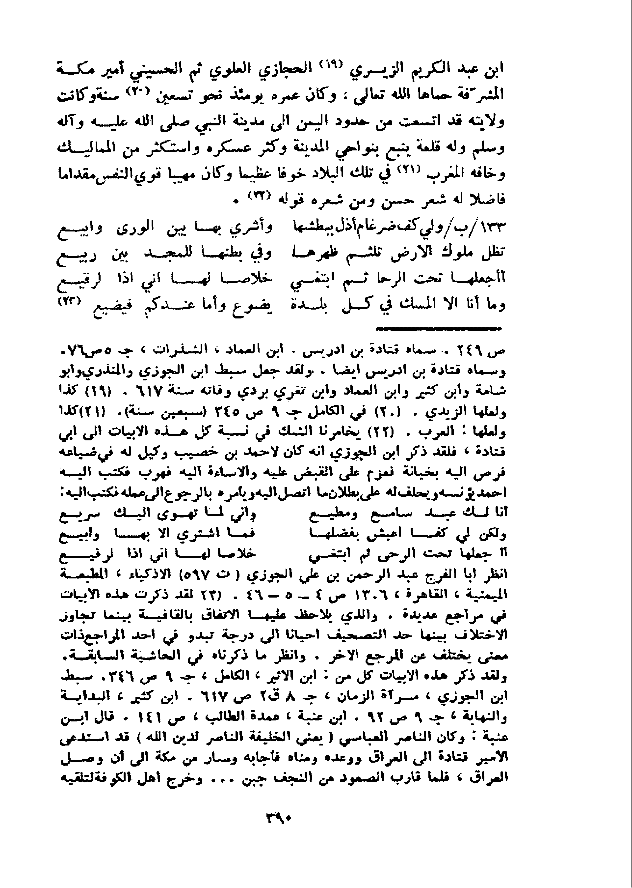 ابن عبد الكريم الزيري 19 الحجازي العلوي ثم الحسيني أمير مكة المشرّفة حماها الله تعالى، وكان عمره يومئذ نحو تسعين 20 سنة وكانت ولايته قد اتسعت من حدود اليمن الى مدينة النبي صلى الله عليه وآله وسلم وله قلعة ينبع بنواحي المدينة وكثر عسكره واستكثر من المماليك وخافه المغرب 21 في تلك البلاد خوفا عظيما وكان مهيبا قوي النفس مقداما فاضلا له شعر حسن ومن شعره قوله 22.