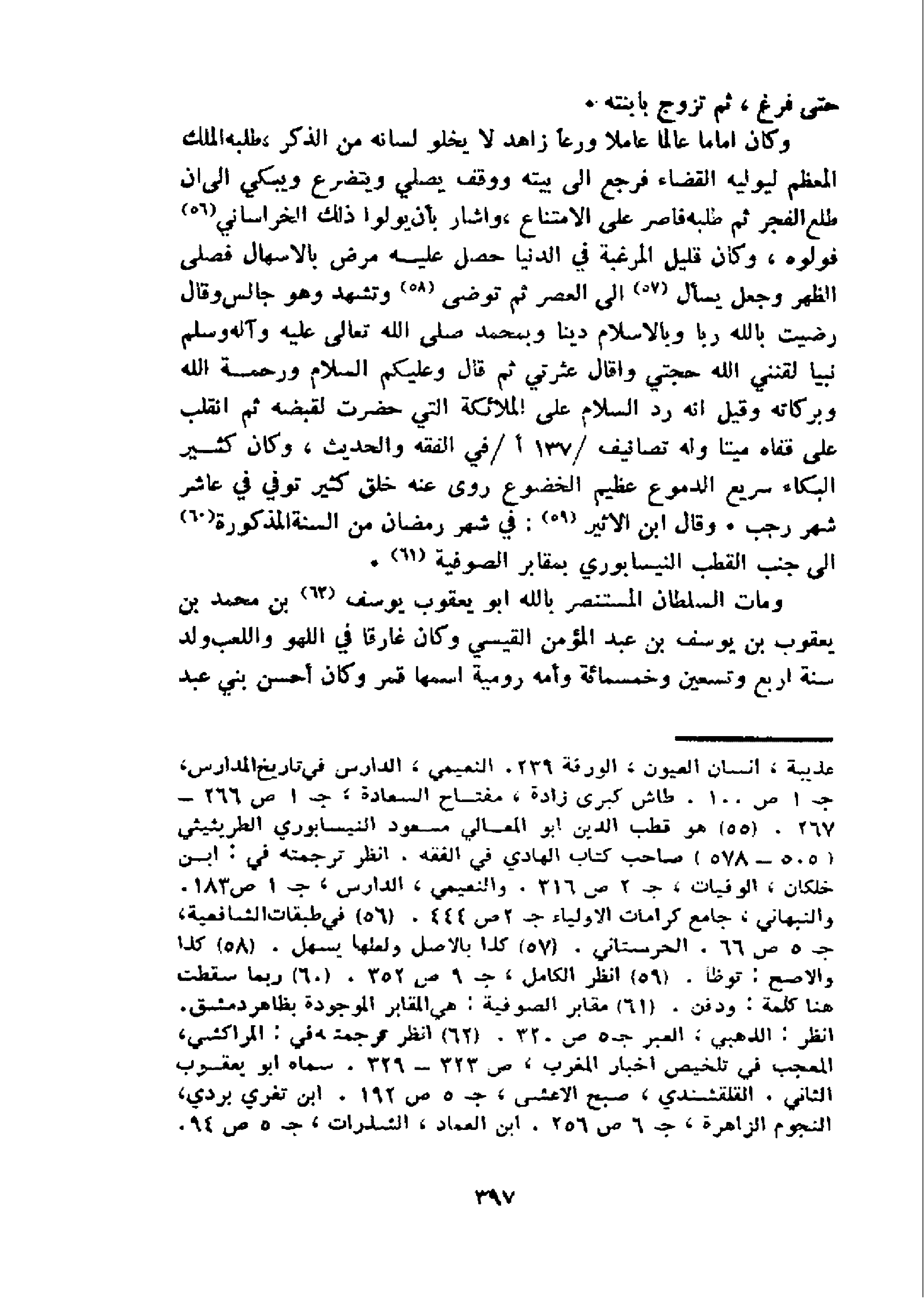 و كان اماما عالما عاملا ورعا زاهد لا يخلو لسانه من الذكر، طلبه الملك المعظم ليوليه القضاء فرجع الى بيته ووقف يصلي ويتضرع ويبكي الى ان طلع الفجر ثم طلبه فاصر على الامتناع، واشار بأن يولوا ذلك الخراساني 56 فولوه، وكان قليل المرغبة في الدنيا حصل عليه مرض بالاسهال فصلى الظهر وجعل يسأل 57 الى العصر ثم توضى 58 و تشهد وهو جالس وقال رضيت بالله ربا وبالاسلام دينا وبمحمد صلى الله تعالى عليه وآله وسلم نبيا لقنني الله حجتي واقال عثرتي ثم قال وعليكم السلام ورحمة الله وبركاته وقيل انه رد السلام على الملائكة التي حضرت لقبضه ثم انقلب على قفاه ميتا وله تصانيف 137 / أ/في الفقه والحديث، وكان كثير البكاء سريع الدموع عظيم الخضوع روى عنه خلق كثير توفي في عاشر شهر رجب. وقال ابن الاثير 59:في شهر رمضان من السنة المذكورة 60 الى جنب القطب النيسابوري بمقابر الصوفية 61.