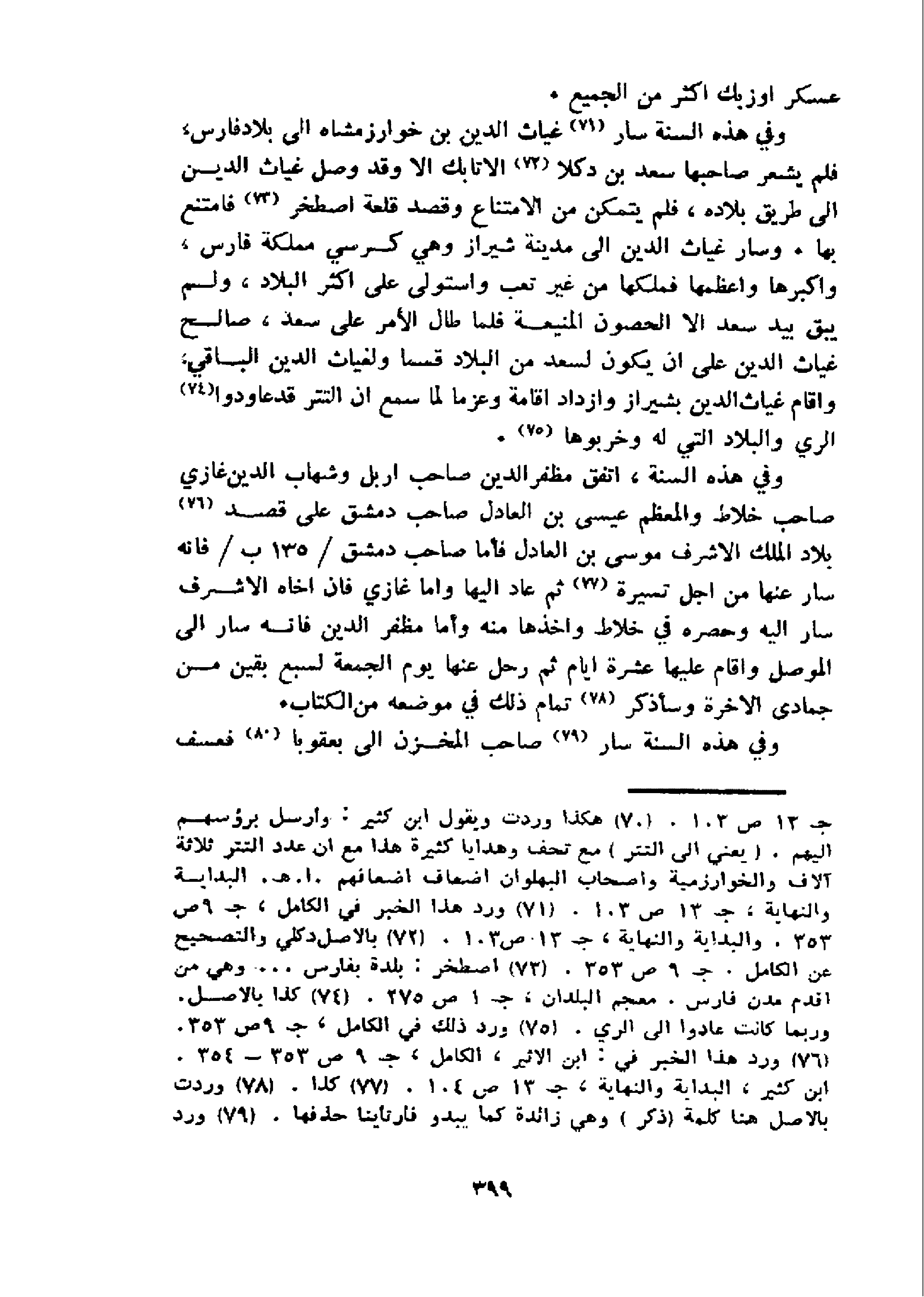و في هذه السنة، اتفق مظفر الدين صاحب اربل وشهاب الدين غازي صاحب خلاط والمعظم عيسى بن العادل صاحب دمشق على قصد 76 بلاد الملك الاشرف موسى بن العادل فأما صاحب دمشق 135 / ب/فانه سار عنها من اجل تسيرة 77 ثم عاد اليها واما غازي فان اخاه الاشرف سار اليه وحصره في خلاط واخذها منه وأما مظفر الدين فانه سار الى الموصل واقام عليها عشرة ايام ثم رحل عنها يوم الجمعة لسبع بقين من جمادى الاخرة وسأذكر 78 تمام ذلك في موضعه من الكتاب.