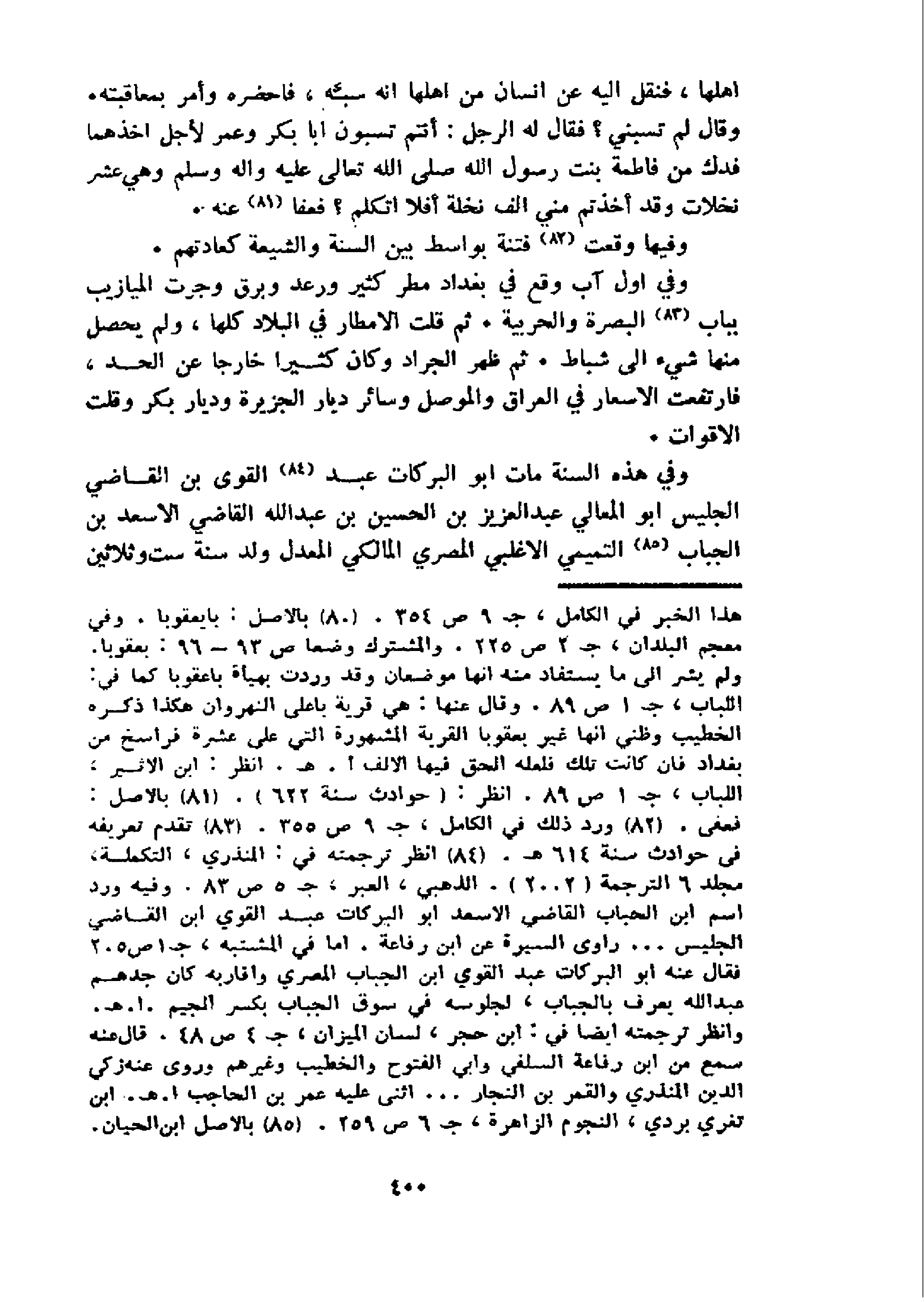 و في هذه السنة مات ابو البركات عبد 84 القوى بن القاضي الجليس ابو المعالي عبد العزيز بن الحسين بن عبد الله القاضي الاسعد بن الجباب 85 التميمي الاغلبي المصري المالكي المعدل ولد سنة ست وثلاثين