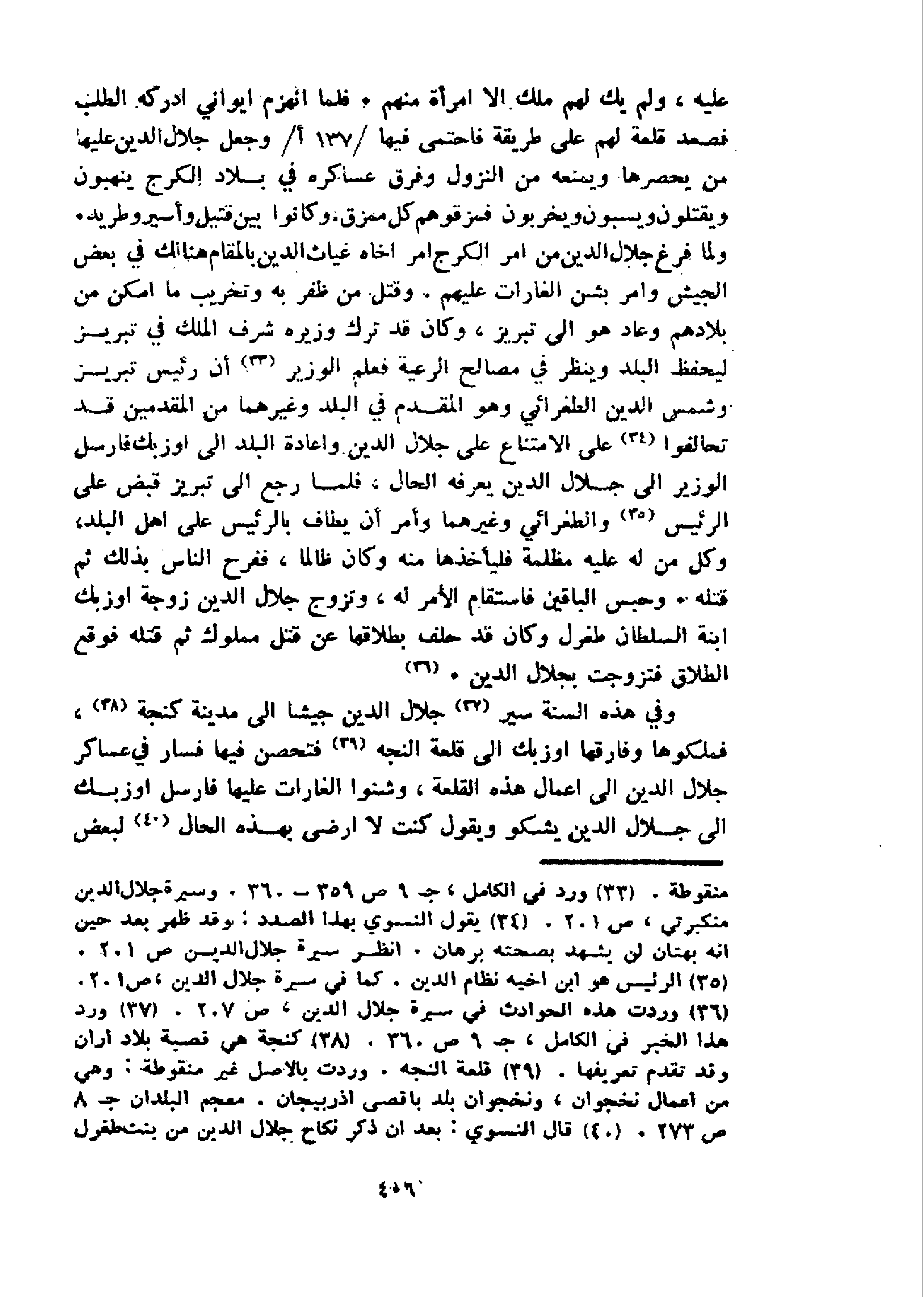 و لما فرغ جلال الدين من امر الكرج امر اخاه غياث الدين بالمقام هنالك في بعض الجيش وامر بشن الغارات عليهم، وقتل من ظفر به وتخريب ما امكن من بلادهم وعاد هو الى تبريز، وكان قد ترك وزيره شرف الملك في تبريز ليحفظ البلد وينظر في مصالح الرعية فعلم الوزير 33 أن رئيس تبريز وشمس الدين الطغرائي وهو المقدم في البلد وغيرهما من المقدمين قد تحالفوا 34 على الامتناع على جلال الدين واعادة البلد الى اوزبك فارسل الوزير الى جلال الدين يعرفه الحال، فلما رجع الى تبريز قبض على الرئيس 35 و الطغرائي وغيرهما وأمر أن يطاف بالرئيس على اهل البلد، وكل من له عليه مظلمة فليأخذها منه وكان ظالما، ففرح الناس بذلك ثم قتله. وحبس الباقين فاستقام الأمر له، وتزوج جلال الدين زوجة اوزبك ابنة السلطان طغرل وكان قد حلف بطلاقها عن قتل مملوك ثم قتله فوقع الطلاق فتزوجت بجلال الدين. 36
