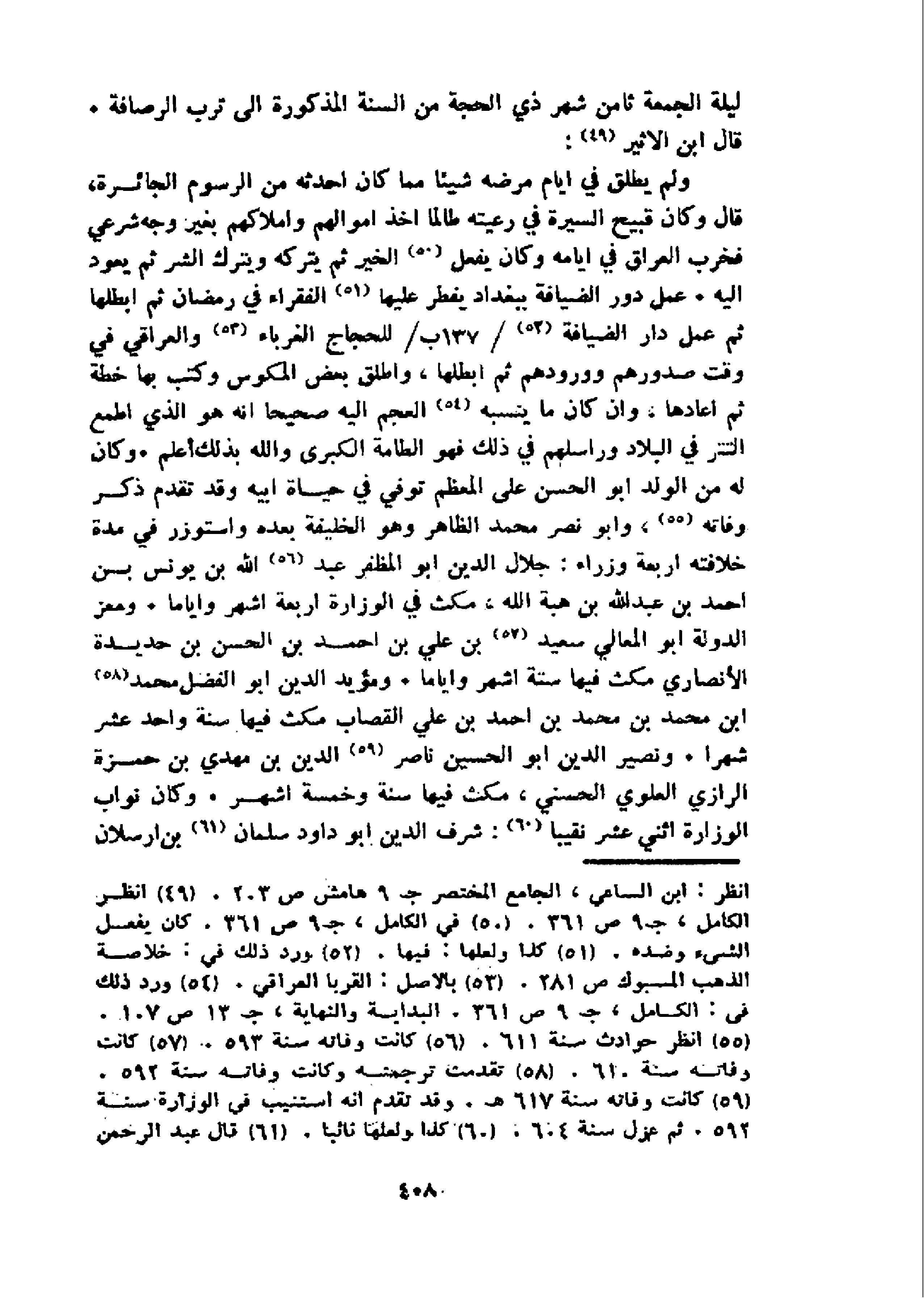 قال ابن الاثير 49: و لم يطلق في ايام مرضه شيئا مما كان احدثه من الرسوم الجائرة، قال وكان قبيح السيرة في رعيته طالما اخذ اموالهم واملاكهم بغير وجه شرعي فخرب العراق في ايامه وكان يفعل 50 الخير ثم يتركه ويترك الشر ثم يعود اليه. عمل دور الضيافة ببغداد يفطر عليها 51 الفقراء في رمضان ثم ابطلها ثم عمل دار الضيافة 52137 / ب/للحجاج الغرباء 53 و العراقي في وقت صدورهم وورودهم ثم ابطلها، واطلق بعض المكوس وكتب بها خطة ثم اعادها. وان كان ما ينسبه 54 العجم اليه صحيحا انه هو الذي اطمع التتر في البلاد وراسلهم في ذلك فهو الطامة الكبرى والله بذلك أعلم. وكان له من الولد ابو الحسن على المعظم توفي في حياة ابيه وقد تقدم ذكر وفاته 55، و ابو نصر محمد الظاهر وهو الخليفة بعده واستوزر في مدة خلافته اربعة وزراء: جلال الدين ابو المظفر عبد 56 اللّه بن يونس بن احمد بن عبد اللّه بن هبة الله، مكث في الوزارة اربعة اشهر واياما. ومعز الدولة ابو المعالي سعيد 57 بن علي بن احمد بن الحسن بن حديدة الأنصاري مكث فيها ستة اشهر واياما. ومؤيد الدين ابو الفضل محمد 58 ابن محمد بن محمد بن احمد بن علي القصاب مكث فيها سنة واحد عشر شهرا. ونصير الدين ابو الحسين ناصر 59 الدين بن مهدي بن حمزة الرازي العلوي الحسني، مكث فيها سنة وخمسة اشهر. وكان نواب الوزارة اثني عشر نقيبا 60:شرف الدين ابو داود سلمان 61 بن ارسلان