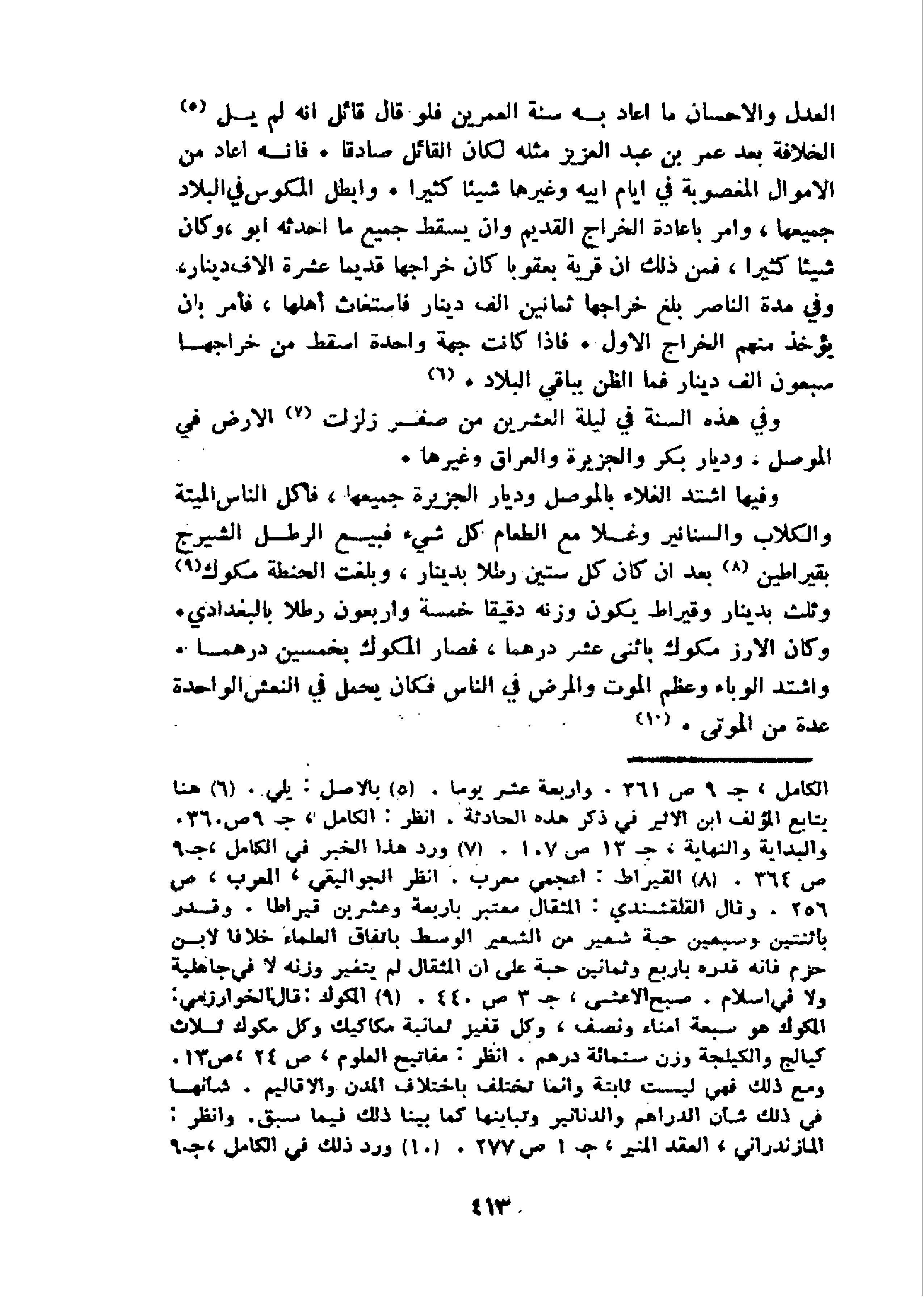 وفيها اشتد الغلاء بالموصل وديار الجزيرة جميعها، فأكل الناس الميتة والكلاب والسنانير وغلا مع الطعام كل شيء فبيع الرطل الشيرج بقيراطين 8 بعد ان كان كل ستين رطلا بدينار، وبلغت الحنطة مكوك 9 و ثلث بدينار وقيراط يكون وزنه دقيقا خمسة واربعون رطلا بالبغدادي.