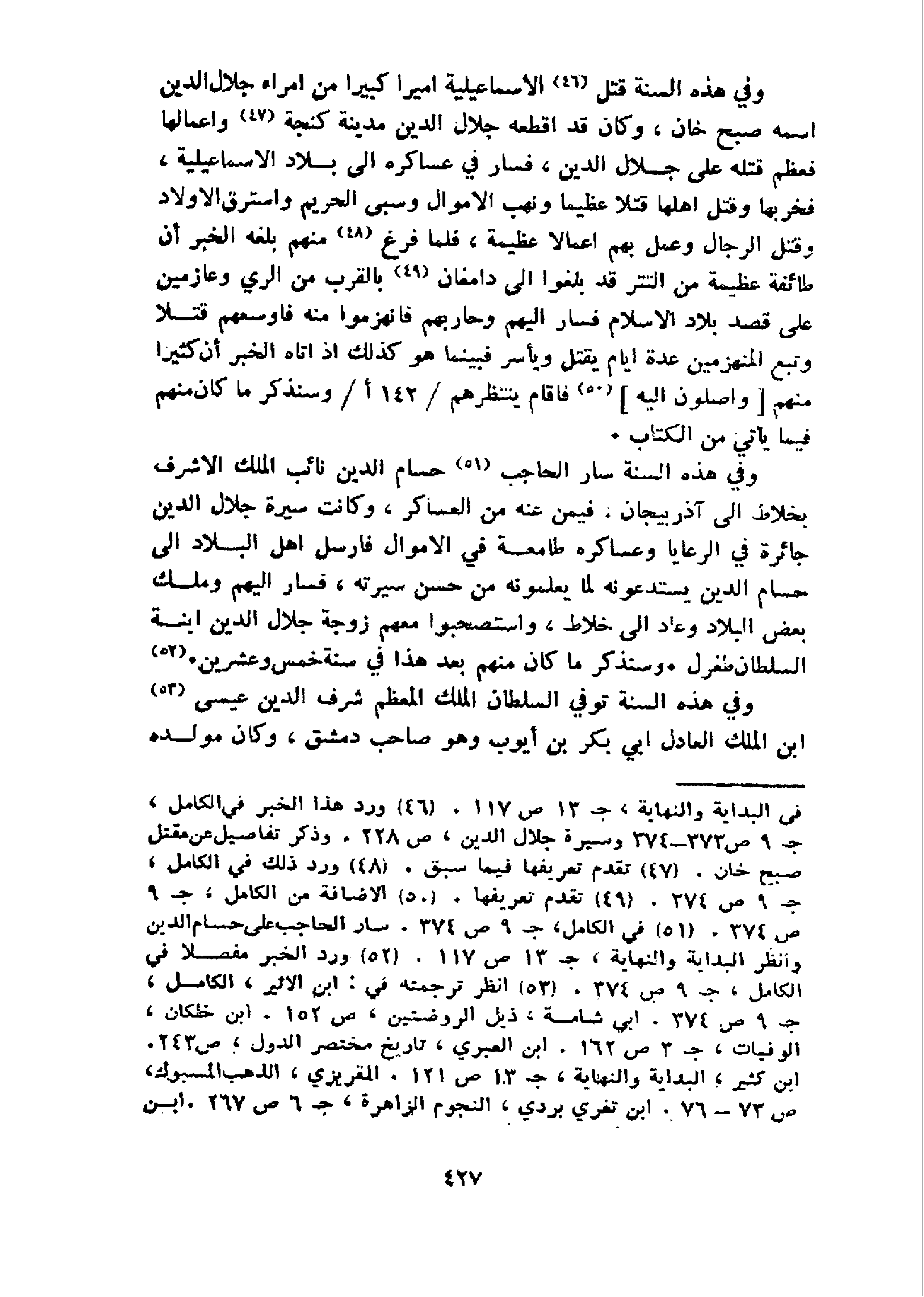 و في هذه السنة قتل 46 الاسماعيلية اميرا كبيرا من امراء جلال الدين اسمه صبح خان، وكان قد اقطعه جلال الدين مدينة كنجة 47 و اعمالها فعظم قتله على جلال الدين، فسار في عساكره الى بلاد الاسماعيلية، فخربها وقتل اهلها قتلا عظيما ونهب الاموال وسبى الحريم واسترق الاولاد وقتل الرجال وعمل بهم اعمالا عظيمة، فلما فرغ 48 منهم بلغه الخبر أن طائفة عظيمة من التتر قد بلغوا الى دامغان 49 بالقرب من الري وعازمين على قصد بلاد الاسلام فسار اليهم وحاربهم فانهزموا منه فاوسعهم قتلا وتبع المنهزمين عدة ايام يقتل ويأسر فبينما هو كذلك اذ اتاه الخبر أن كثيرا منهم [واصلون اليه] 50 فاقام ينتظرهم 142 / أ/و سنذكر ما كان منهم فيما يأتي من الكتاب.