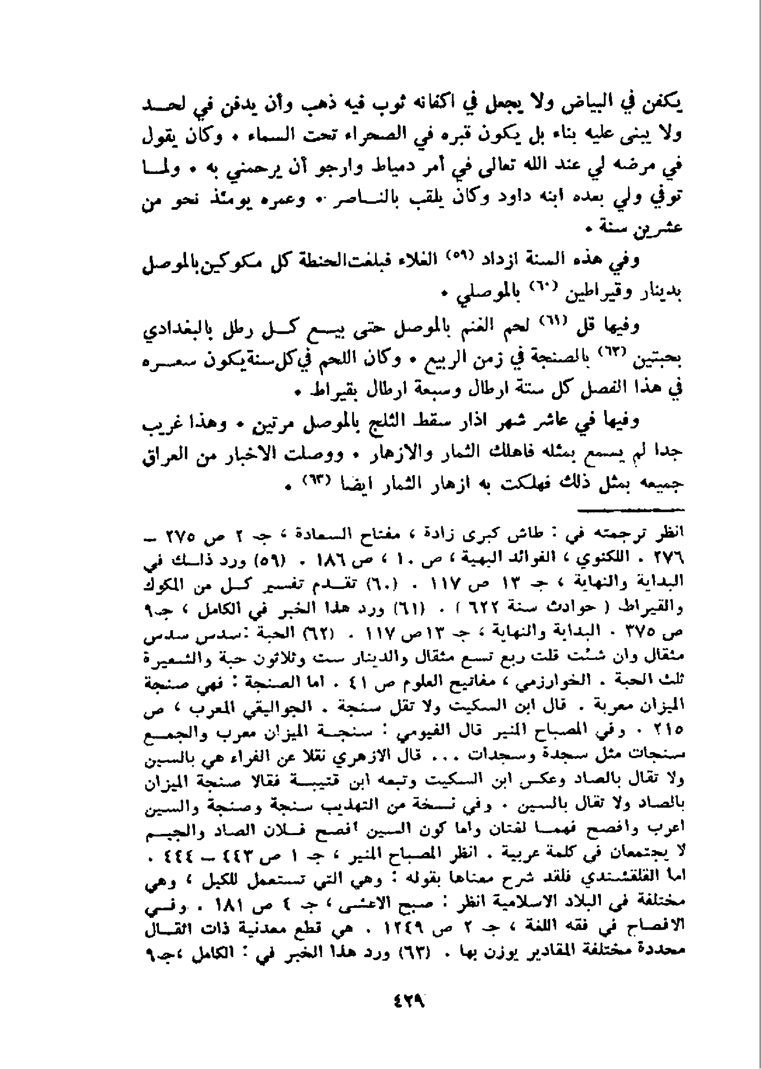 وفيها قل 61 لحم الغنم بالموصل حتى بيع كل رطل بالبغدادي بحبتين 62 بالصنجة في زمن الربيع. وكان اللحم في كل سنة يكون سعره في هذا الفصل كل ستة ارطال وسبعة ارطال بقيراط.