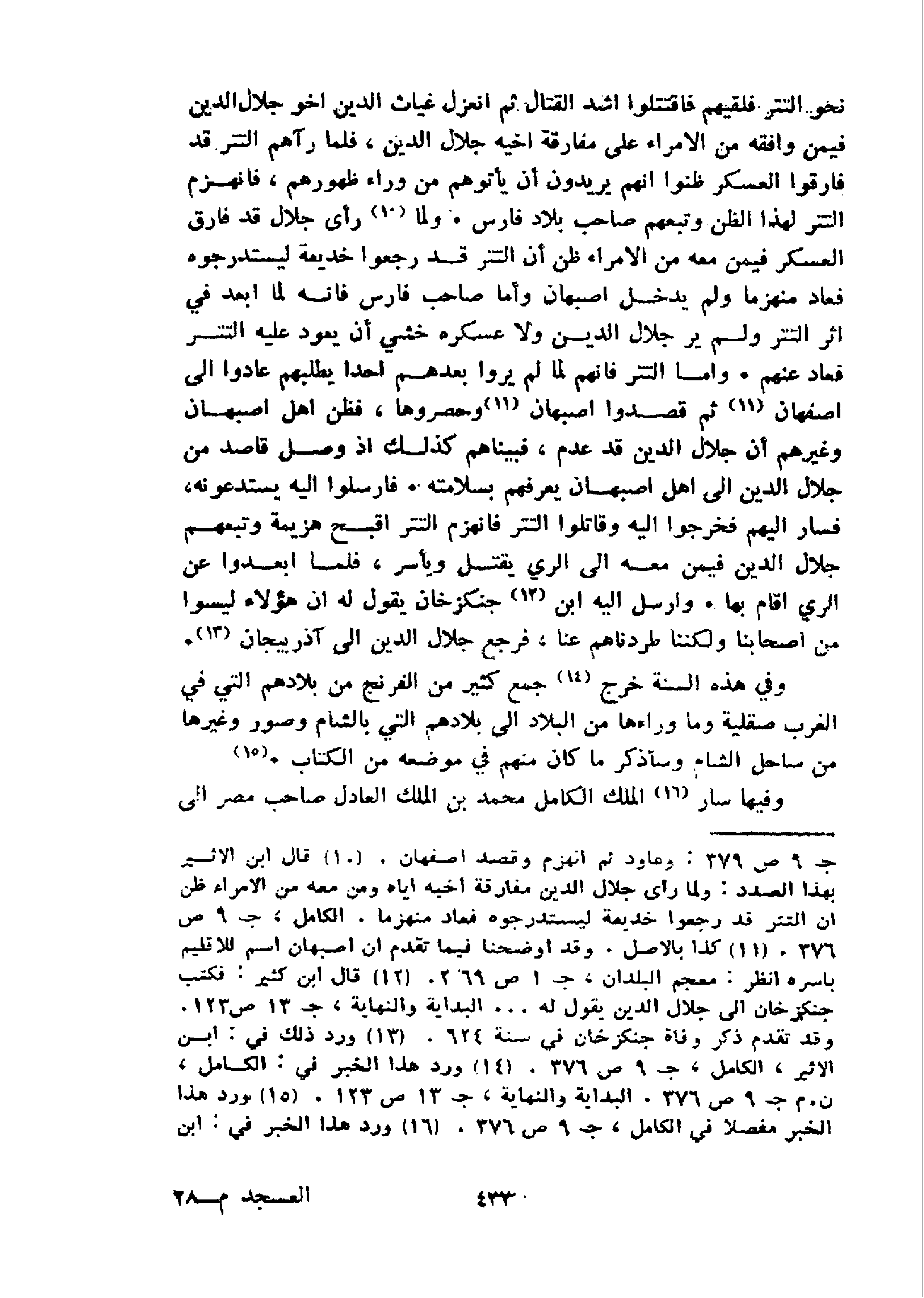 نحو التتر فلقيهم فاقتتلوا اشد القتال ثم انعزل غياث الدين اخو جلال الدين فيمن وافقه من الامراء على مفارقة اخيه جلال الدين، فلما رآهم التتر قد فارقوا العسكر ظنوا انهم يريدون أن يأتوهم من وراء ظهورهم، فانهزم التتر لهذا الظن وتبعهم صاحب بلاد فارس. ولما 10 رأى جلال قد فارق العسكر فيمن معه من الامراء ظن أن التتر قد رجعوا خديعة ليستدرجوه فعاد منهزما ولم يدخل اصبهان وأما صاحب فارس فانه لما ابعد في اثر التتر ولم ير جلال الدين ولا عسكره خشي أن يعود عليه التتر فعاد عنهم. واما التتر فانهم لما لم يروا بعدهم احدا يطلبهم عادوا الى اصفهان 11 ثم قصدوا اصبهان 11 و حصروها، فظن اهل اصبهان وغيرهم أن جلال الدين قد عدم، فبيناهم كذلك اذ وصل قاصد من جلال الدين الى اهل اصبهان يعرفهم بسلامته. فارسلوا اليه يستدعونه، فسار اليهم فخرجوا اليه وقاتلوا التتر فانهزم التتر اقبح هزيمة وتبعهم جلال الدين فيمن معه الى الري يقتل ويأسر، فلما ابعدوا عن الري اقام بها. وارسل اليه ابن 12 جنكز خان يقول له ان هؤلاء ليسوا من اصحابنا ولكننا طردناهم عنا، فرجع جلال الدين الى آذربيجان 13.