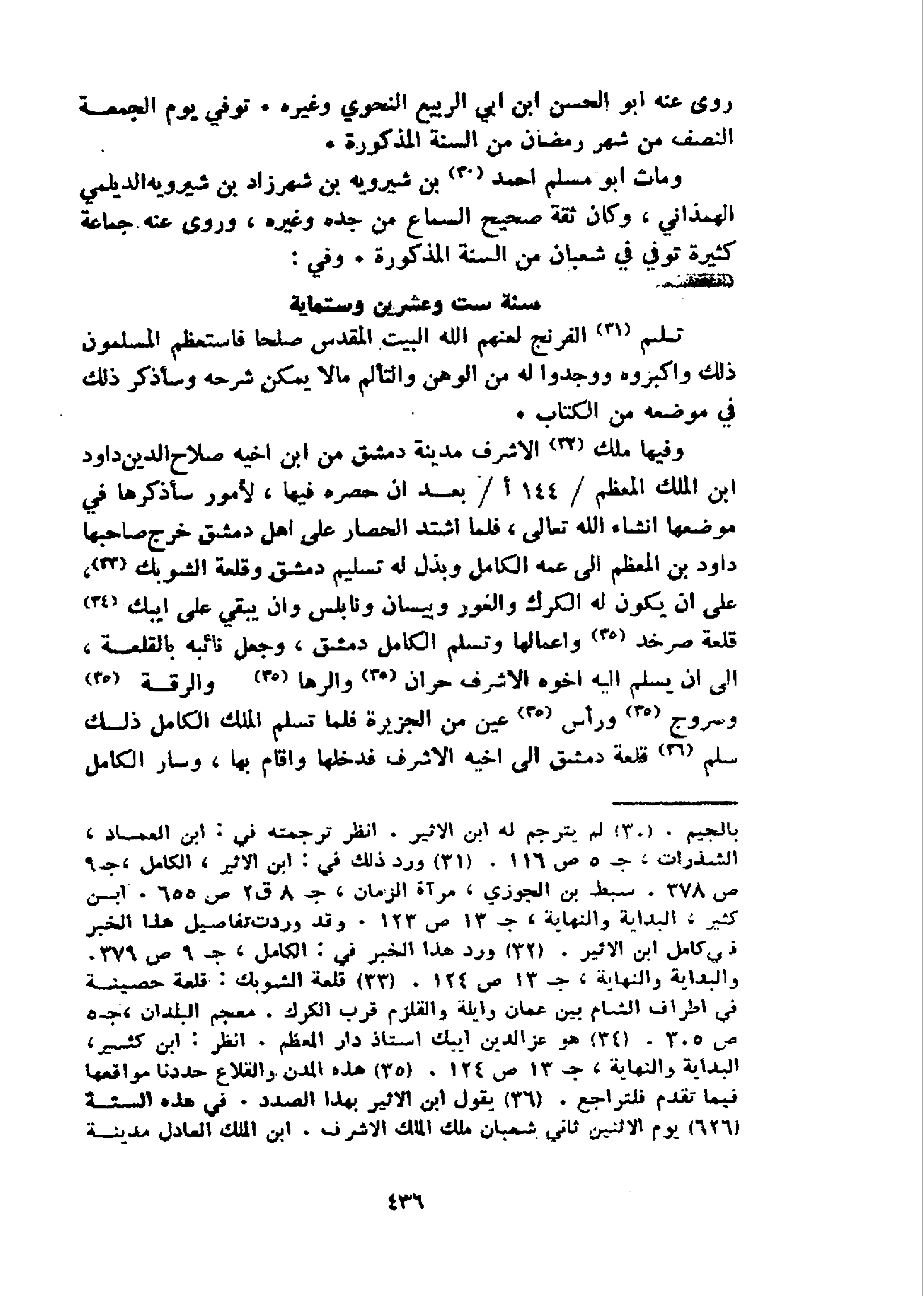 وفيها ملك 32 الاشرف مدينة دمشق من ابن اخيه صلاح الدين داود ابن الملك المعظم 144 / أ/بعد ان حصره فيها، لأمور سأذكرها في موضعها انشاء الله تعالى، فلما اشتد الحصار على اهل دمشق خرج صاحبها داود بن المعظم الى عمه الكامل وبذل له تسليم دمشق وقلعة الشوبك 33، على ان يكون له الكرك والغور وبيسان ونابلس وان يبقي على ايبك 34 قلعة صرخد 35 و اعمالها وتسلم الكامل دمشق، وجعل نائبه بالقلعة، الى ان يسلم اليه اخوه الاشرف حران 35 و الرها 35 و الرقة 35 و سروج 35 و رأس 35 عين من الجزيرة فلما تسلم الملك الكامل ذلك سلم 36 قلعة دمشق الى اخيه الاشرف فدخلها واقام بها، وسار الكامل