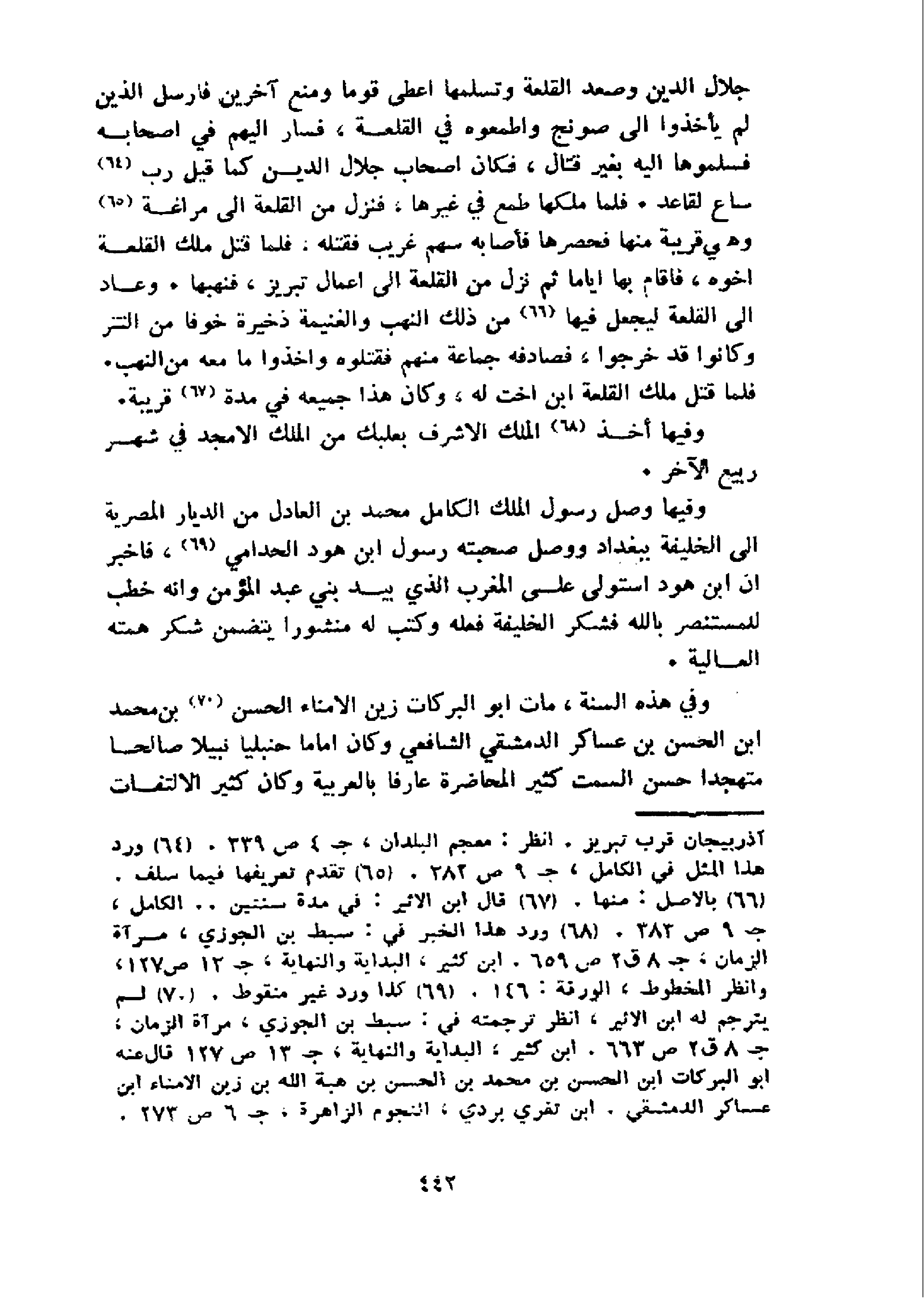 جلال الدين وصعد القلعة وتسلمها اعطى قوما ومنع آخرين فارسل الذين لم يأخذوا الى صونج واطمعوه في القلعة، فسار اليهم في اصحابه فسلموها اليه بغير قتال، فكان اصحاب جلال الدين كما قيل رب 64 ساع لقاعد. فلما ملكها طمع في غيرها، فنزل من القلعة الى مراغة 65 و هي قريبة منها فحصرها فأصابه سهم غريب فقتله. فلما قتل ملك القلعة اخوه، فاقام بها اياما ثم نزل من القلعة الى اعمال تبريز، فنهبها. وعاد الى القلعة ليجعل فيها 66 من ذلك النهب والغنيمة ذخيرة خوفا من التتر وكانوا قد خرجوا، فصادفه جماعة منهم فقتلوه واخذوا ما معه من النهب.