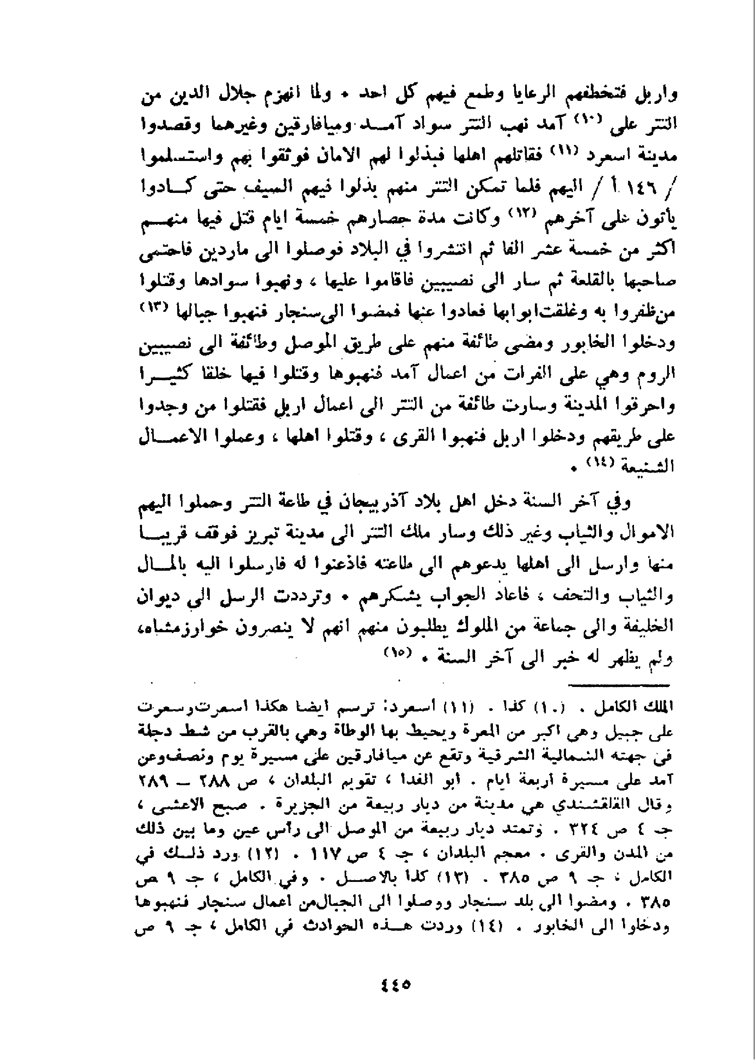 و اربل فتخطفهم الرعايا وطمع فيهم كل احد. ولما انهزم جلال الدين من التتر على 10 آمد نهب التتر سواد آمد وميافارقين وغيرهما وقصدوا مدينة اسعرد 11 فقاتلهم اهلها فبذلوا لهم الامان فوثقوا بهم واستسلموا 146 / أ/اليهم فلما تمكن التتر منهم بذلوا فيهم السيف حتى كادوا يأتون على آخرهم 12 و كانت مدة حصارهم خمسة ايام قتل فيها منهم اكثر من خمسة عشر الفا ثم انتشروا في البلاد فوصلوا الى ماردين فاحتمى صاحبها بالقلعة ثم سار الى نصيبين فاقاموا عليها، ونهبوا سوادها وقتلوا من ظفروا به وغلقت ابوابها فعادوا عنها فمضوا الى سنجار فنهبوا جبالها 13 و دخلوا الخابور ومضى طائفة منهم على طريق الموصل وطائفة الى نصيبين الروم وهي على الفرات من اعمال آمد فنهبوها وقتلوا فيها خلقا كثيرا واحرقوا المدينة وسارت طائفة من التتر الى اعمال اربل فقتلوا من وجدوا على طريقهم ودخلوا اربل فنهبوا القرى، وقتلوا اهلها، وعملوا الاعمال الشنيعة 14.