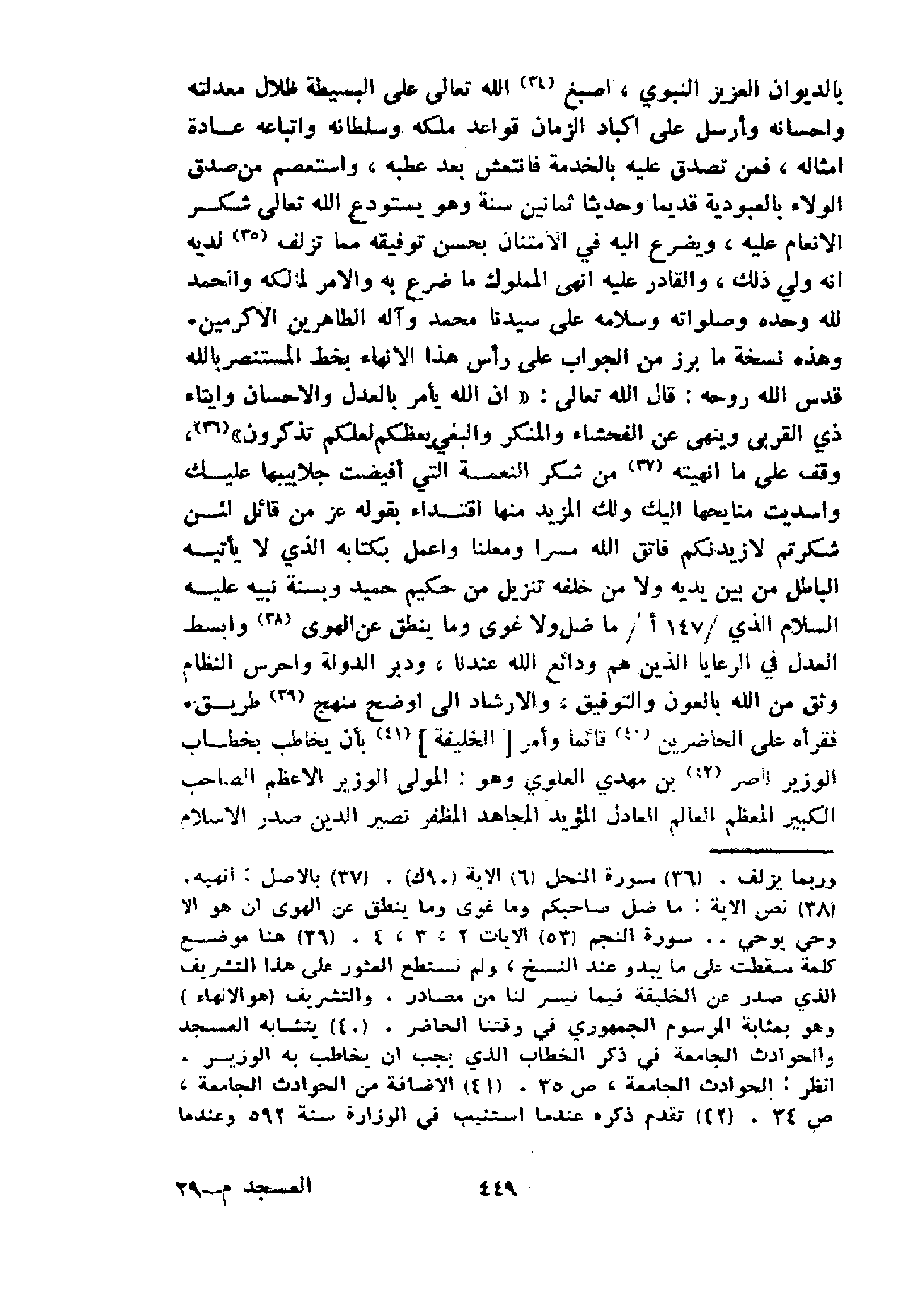 و هذه نسخة ما برز من الجواب على رأس هذا الانهاء بخط المستنصر بالله قدس الله روحه: قال الله تعالى: «إِنَّ اَللّهَ يَأْمُرُ بِالْعَدْلِ وَ اَلْإِحْسانِ وَ إِيتاءِ ذِي اَلْقُرْبى وَ يَنْهى عَنِ اَلْفَحْشاءِ وَ اَلْمُنْكَرِ وَ اَلْبَغْيِ يَعِظُكُمْ لَعَلَّكُمْ تَذَكَّرُونَ» 36، وقف على ما انهيته 37 من شكر النعمة التي أفيضت جلابيبها عليك واسديت منايحها اليك ولك المزيد منها اقتداء بقوله عز من قائل لئن شكرتم لازيدنكم فاتق الله مسرا ومعلنا واعمل بكتابه الذي لا يأتيه الباطل من بين يديه ولا من خلفه تنزيل من حكيم حميد وبسنة نبيه عليه السلام الذي 147 / أ/ما ضل ولا غوى وَ ما يَنْطِقُ عَنِ اَلْهَوى 38 و ابسط العدل في الرعايا الذين هم ودائع الله عندنا، ودبر الدولة واحرس النظام وثق من الله بالعون والتوفيق، والارشاد الى اوضح منهج 39 طريق.