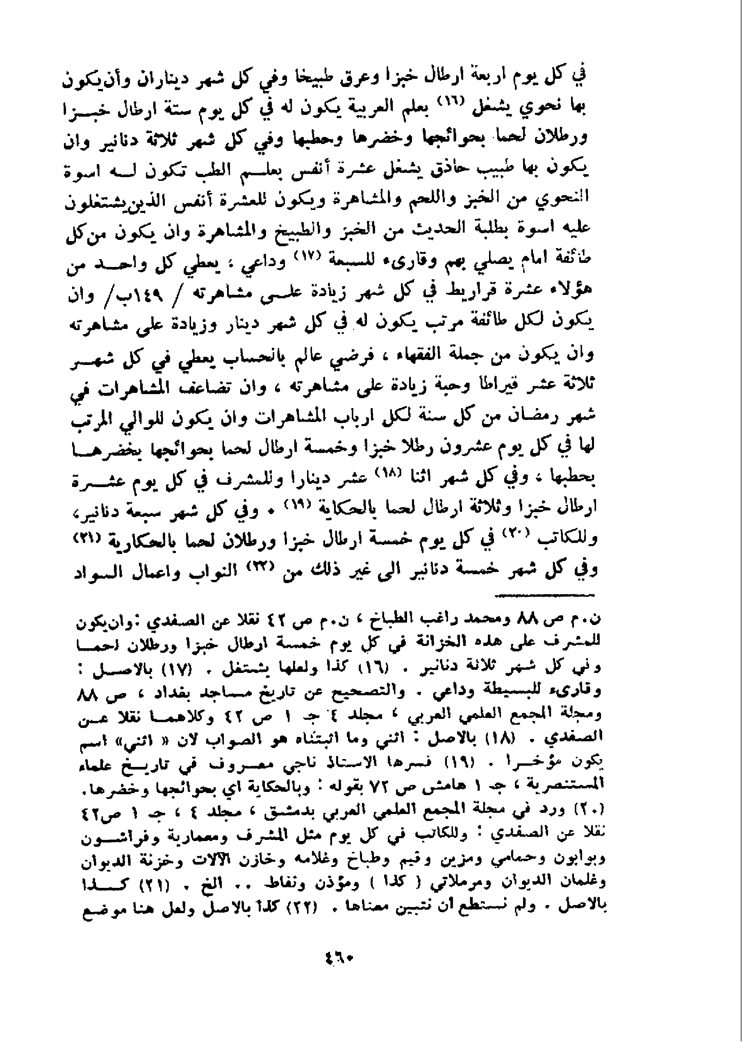 في كل يوم اربعة ارطال خبزا وعرق طبيخا وفي كل شهر ديناران وأن يكون بها نحوي يشغل 16 بعلم العربية يكون له في كل يوم ستة ارطال خبزا ورطلان لحما بحوائجها وخضرها وحطبها وفي كل شهر ثلاثة دنانير وان يكون بها طبيب حاذق يشغل عشرة أنفس بعلم الطب تكون له اسوة النحوي من الخبز واللحم والمشاهرة ويكون للعشرة أنفس الذين يشتغلون عليه اسوة بطلبة الحديث من الخبز والطبيخ والمشاهرة وان يكون من كل طائفة امام يصلي بهم وقارىء للسبعة 17 و داعي، يعطي كل واحد من هؤلاء عشرة قراريط في كل شهر زيادة على مشاهرته 149 / ب/و ان يكون لكل طائفة مرتب يكون له في كل شهر دينار وزيادة على مشاهرته وان يكون من جملة الفقهاء، فرضي عالم بالحساب يعطي في كل شهر ثلاثة عشر قيراطا وحبة زيادة على مشاهرته، وان تضاعف المشاهرات في شهر رمضان من كل سنة لكل ارباب المشاهرات وان يكون للوالي المرتب لها في كل يوم عشرون رطلا خبزا وخمسة ارطال لحما بحوائجها بخضرها بحطبها، وفي كل شهر اثنا 18 عشر دينارا وللمشرف في كل يوم عشرة ارطال خبزا وثلاثة ارطال لحما بالحكاية 19.و في كل شهر سبعة دنانير، وللكاتب 20 في كل يوم خمسة ارطال خبزا ورطلان لحما بالحكارية 21 و في كل شهر خمسة دنانير الى غير ذلك من 22 النواب واعمال السواد