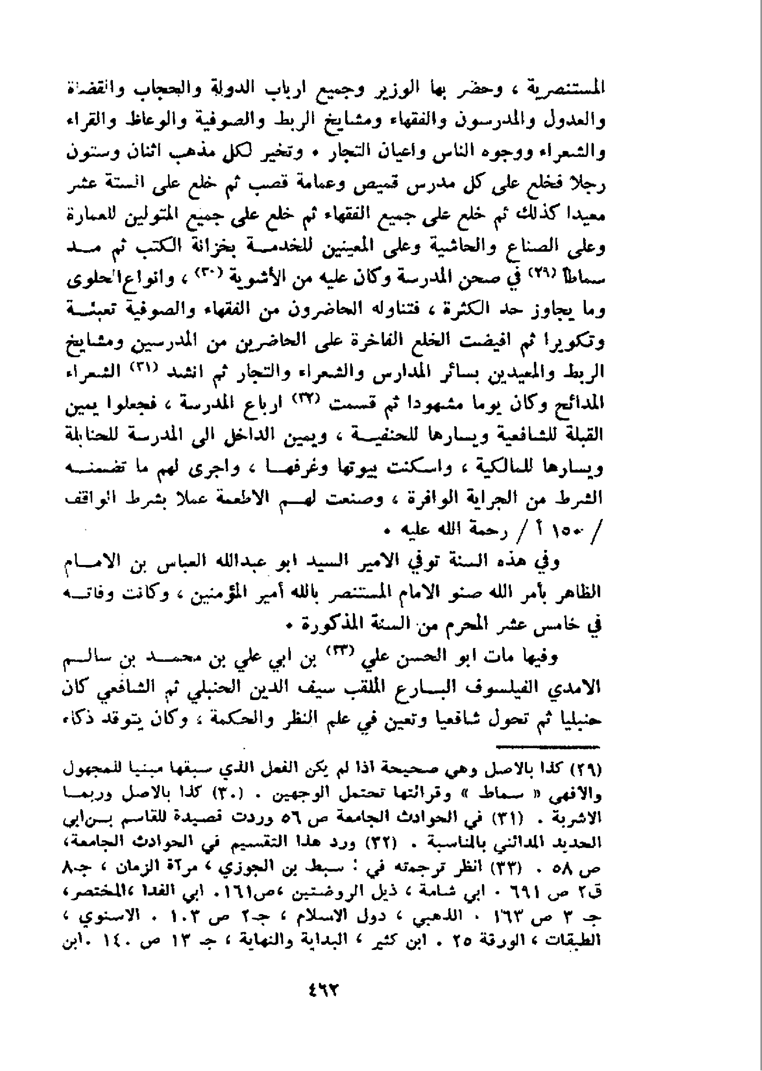 المستنصرية، وحضر بها الوزير وجميع ارباب الدولة والحجاب والقضاة والعدول والمدرسون والفقهاء ومشايخ الربط والصوفية والوعاظ والقراء والشعراء ووجوه الناس واعيان التجار. وتخير لكل مذهب اثنان وستون رجلا فخلع على كل مدرس قميص وعمامة قصب ثم خلع على الستة عشر معيدا كذلك ثم خلع على جميع الفقهاء ثم خلع على جميع المتولين للعمارة وعلى الصناع والحاشية وعلى المعينين للخدمة بخزانة الكتب ثم مد سماطا 29 في صحن المدرسة وكان عليه من الأشوية 30، و انواع الحلوى وما يجاوز حد الكثرة، فتناوله الحاضرون من الفقهاء والصوفية تعبئة وتكويرا ثم افيضت الخلع الفاخرة على الحاضرين من المدرسين ومشايخ الربط والمعيدين بسائر المدارس والشعراء والتجار ثم انشد 31 الشعراء المدائح وكان يوما مشهودا ثم قسمت 32 ارباع المدرسة، فجعلوا يمين القبلة للشافعية ويسارها للحنفية، ويمين الداخل الى المدرسة للحنابلة ويسارها للمالكية، واسكنت بيوتها وغرفها، واجرى لهم ما تضمنه الشرط من الجراية الوافرة، وصنعت لهم الاطعمة عملا بشرط الواقف 150 / أ/رحمة الله عليه.
