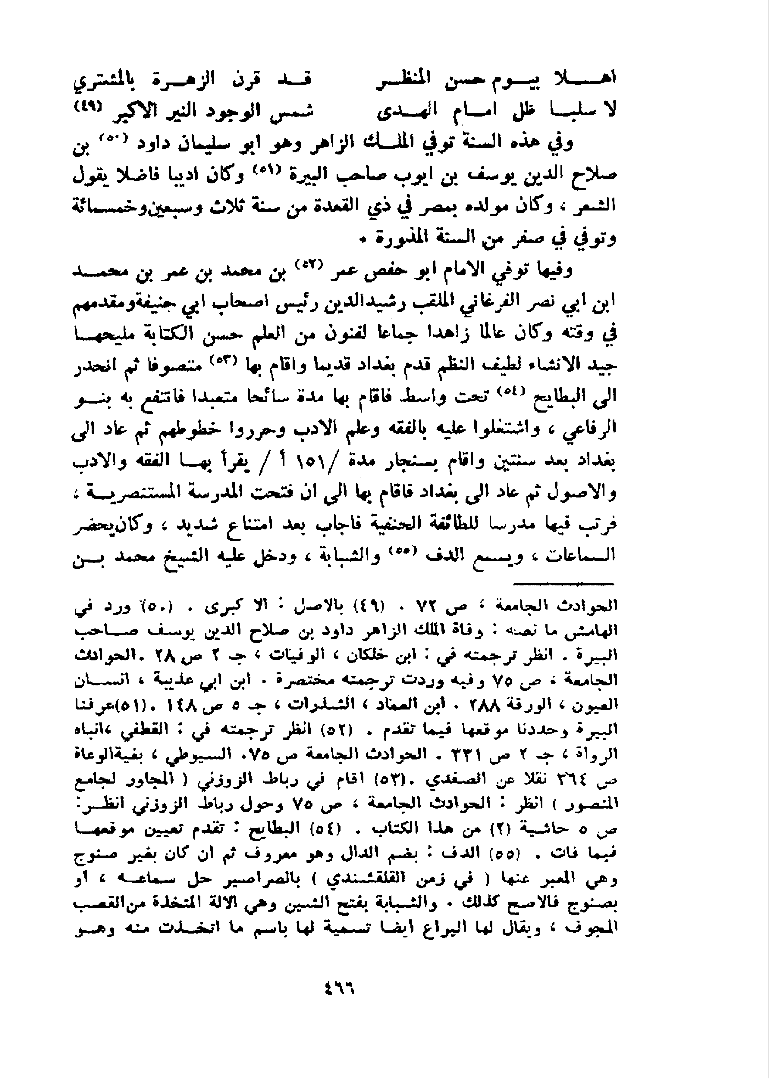 اهلا بيوم حسن المنظرقد قرن الزهرة بالمشتري لا سلبا ظل امام الهدىشمس الوجود النير الاكبر 49 و في هذه السنة توفي الملك الزاهر وهو ابو سليمان داود 50 بن صلاح الدين يوسف بن ايوب صاحب البيرة 51 و كان اديبا فاضلا يقول الشعر، وكان مولده بمصر في ذي القعدة من سنة ثلاث وسبعين وخمسمائة وتوفي في صفر من السنة المذكورة.
