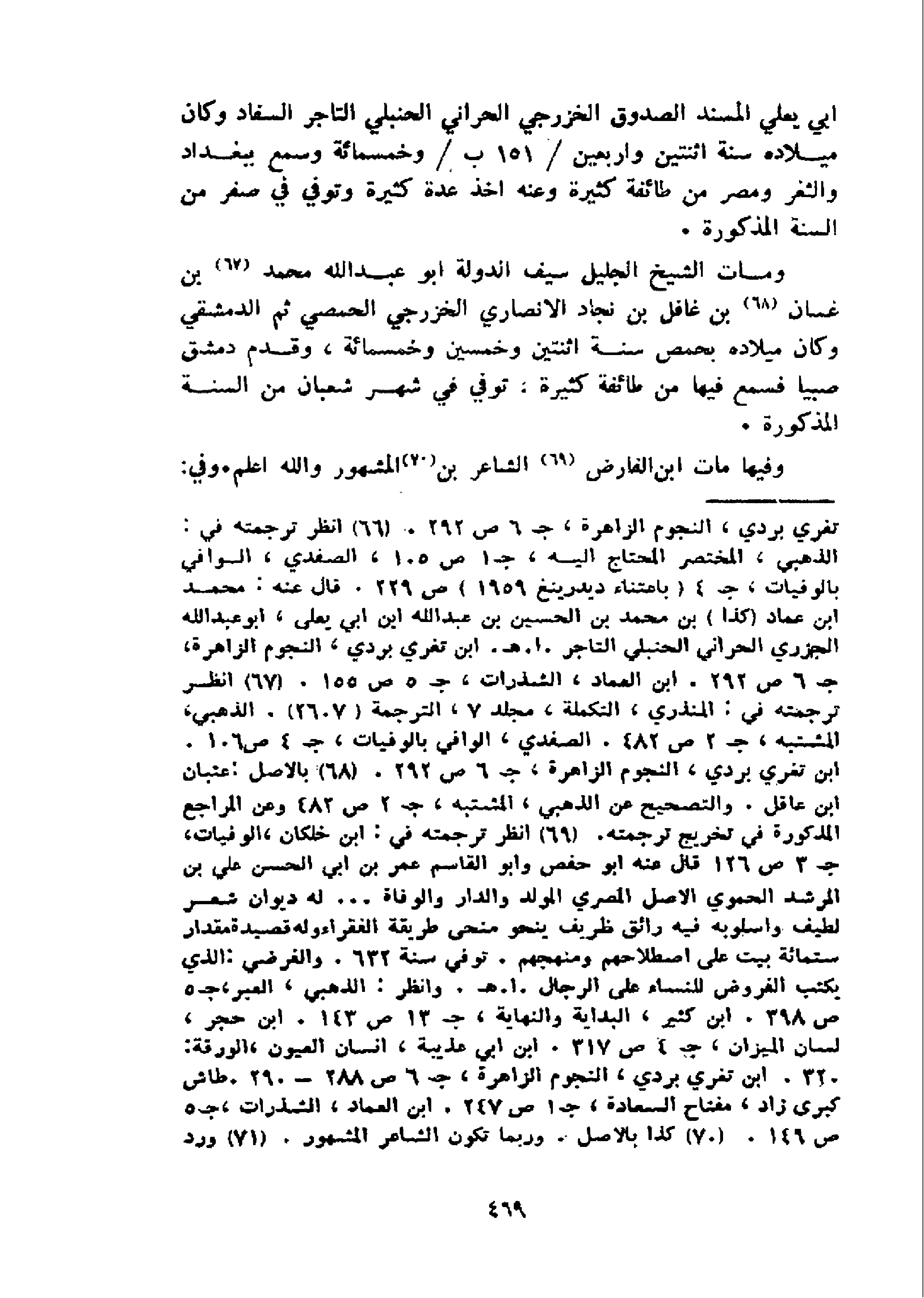 ابي يعلي المسند الصدوق الخزرجي الحراني الحنبلي التاجر السفاد وكان ميلاده سنة اثنتين واربعين 151 / ب/و خمسمائة وسمع ببغداد والثغر ومصر من طائفة كثيرة وعنه اخذ عدة كثيرة وتوفي في صفر من السنة المذكورة.