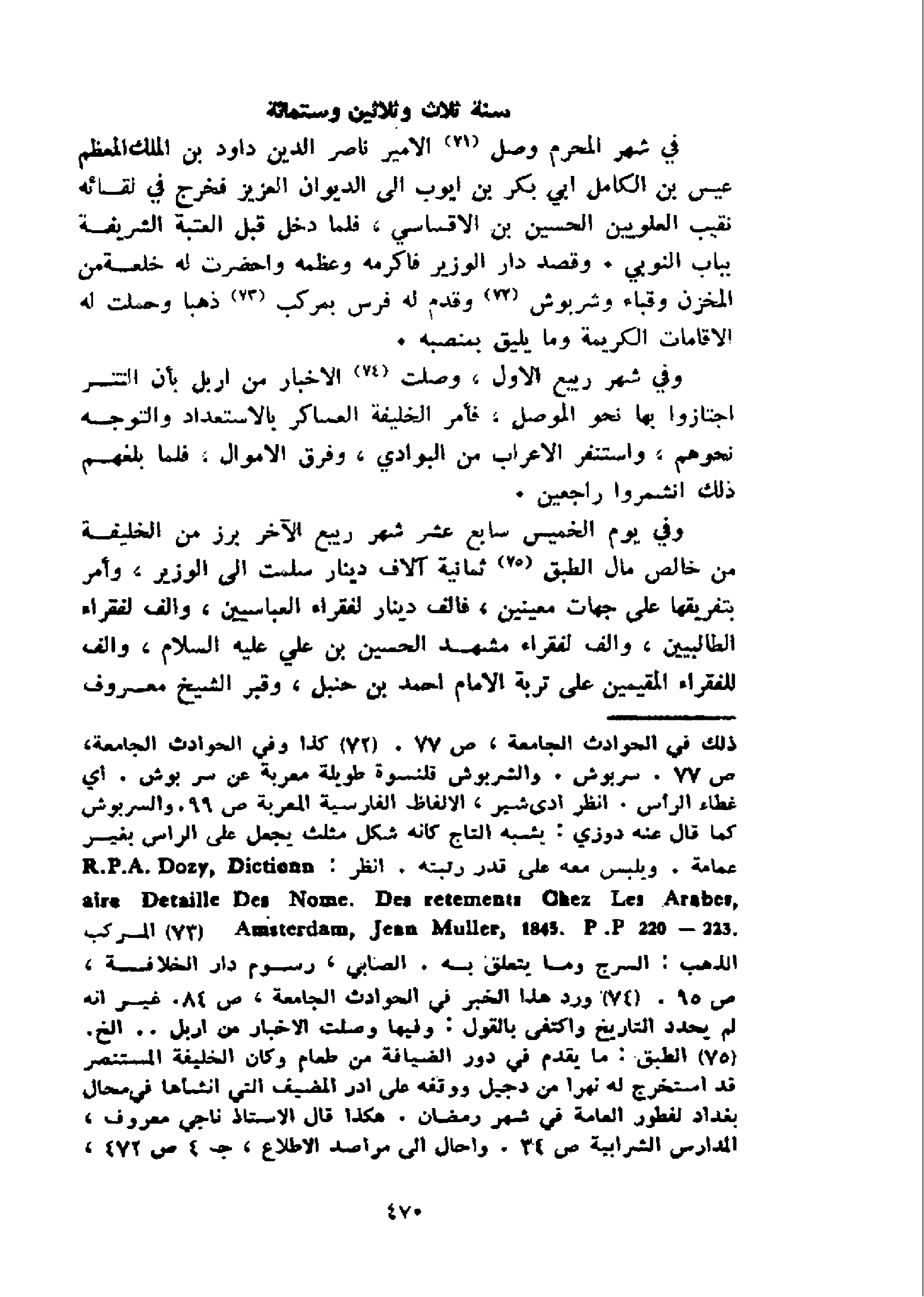 في شهر المحرم وصل 71 الامير ناصر الدين داود بن الملك المعظم عيس بن الكامل ابي بكر بن ايوب الى الديوان العزيز فخرج في لقائه نقيب العلويين الحسين بن الاقساسي، فلما دخل قبل العتبة الشريفة بباب النوبي. وقصد دار الوزير فاكرمه وعظمه واحضرت له خلعة من المخزن وقباء وشربوش 72 و قدم له فرس بمركب 73 ذهبا وحملت له الاقامات الكريمة وما يليق بمنصبه.