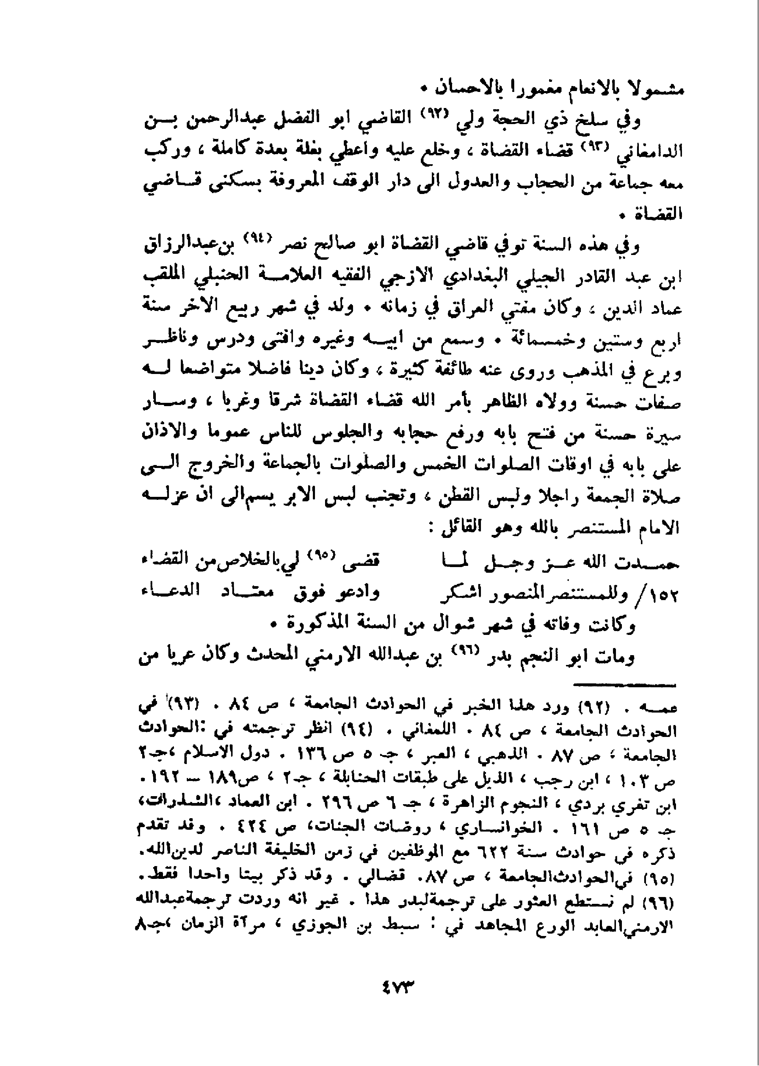 و في هذه السنة توفي قاضي القضاة ابو صالح نصر 94 بن عبد الرزاق ابن عبد القادر الجيلي البغدادي الازجي الفقيه العلامة الحنبلي الملقب عماد الدين، وكان مفتي العراق في زمانه. ولد في شهر ربيع الاخر سنة اربع وستين وخمسمائة. وسمع من ابيه وغيره وافتى ودرس وناظر وبرع في المذهب وروى عنه طائفة كثيرة، وكان دينا فاضلا متواضعا له صفات حسنة وولاه الظاهر بأمر الله قضاء القضاة شرقا وغربا، وسار سيرة حسنة من فتح بابه ورفع حجابه والجلوس للناس عموما والاذان على بابه في اوقات الصلوات الخمس والصلوات بالجماعة والخروج الى صلاة الجمعة راجلا ولبس القطن، وتجنب لبس الابريسم الى ان عزله الامام المستنصر بالله وهو القائل: