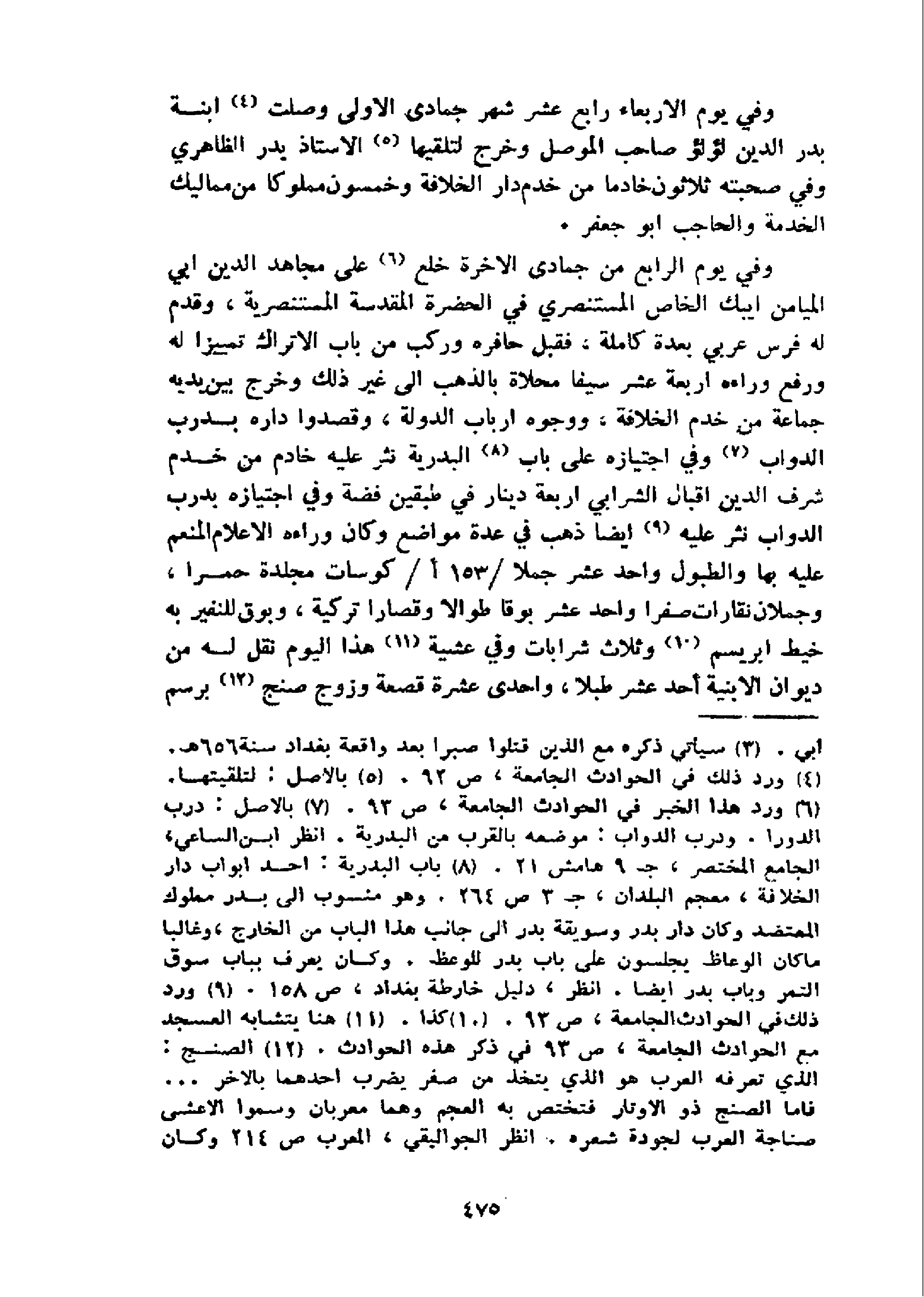 و في يوم الاربعاء رابع عشر شهر جمادى الاولى وصلت 4 ابنة بدر الدين لؤلؤ صاحب الموصل وخرج لتلقيها 5 الاستاذ بدر الظاهري وفي صحبته ثلاثون خادما من خدم دار الخلافة وخمسون مملوكا من مماليك الخدمة والحاجب ابو جعفر.