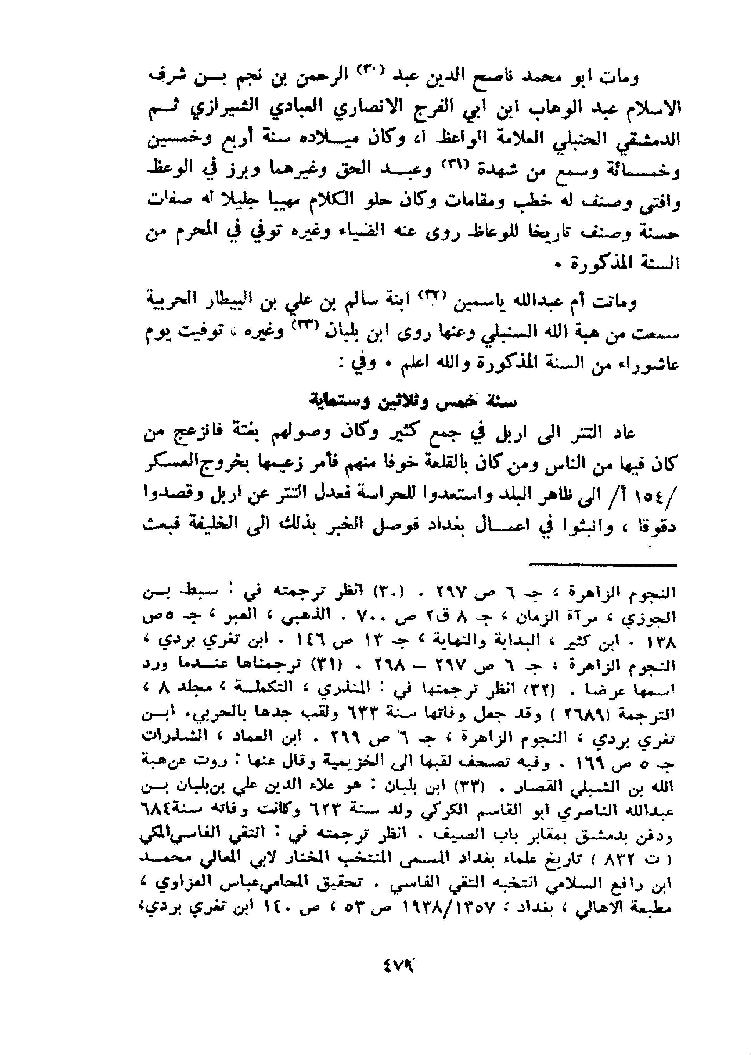 و مات ابو محمد ناصح الدين عبد 30 الرحمن بن نجم بن شرف الاسلام عبد الوهاب ابن ابي الفرج الانصاري العبادي الشيرازي ثم الدمشقي الحنبلي العلامة الواعظ ا، وكان ميلاده سنة أربع وخمسين وخمسمائة وسمع من شهدة 31 و عبد الحق وغيرهما وبرز في الوعظ وافتى وصنف له خطب ومقامات وكان حلو الكلام مهيبا جليلا له صفات حسنة وصنف تاريخا للوعاظ روى عنه الضياء وغيره توفي في المحرم من السنة المذكورة.