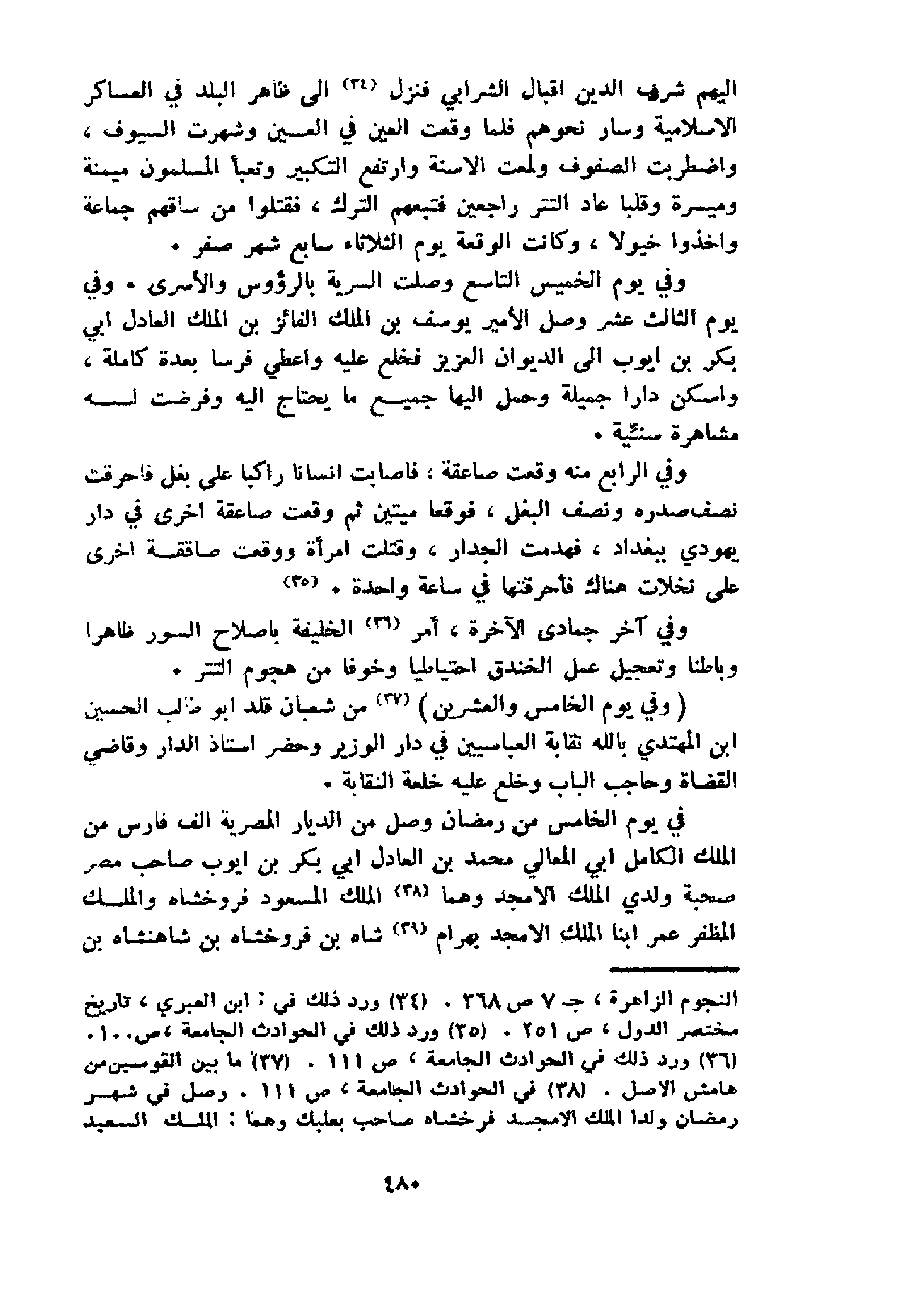 في يوم الخامس من رمضان وصل من الديار المصرية الف فارس من الملك الكامل ابي المعالي محمد بن العادل ابي بكر بن ايوب صاحب مصر صحبة ولدي الملك الامجد وهما 38 الملك المسعود فروخشاه والملك المظفر عمر ابنا الملك الامجد بهرام 39 شاه بن فروخشاه بن شاهنشاه بن