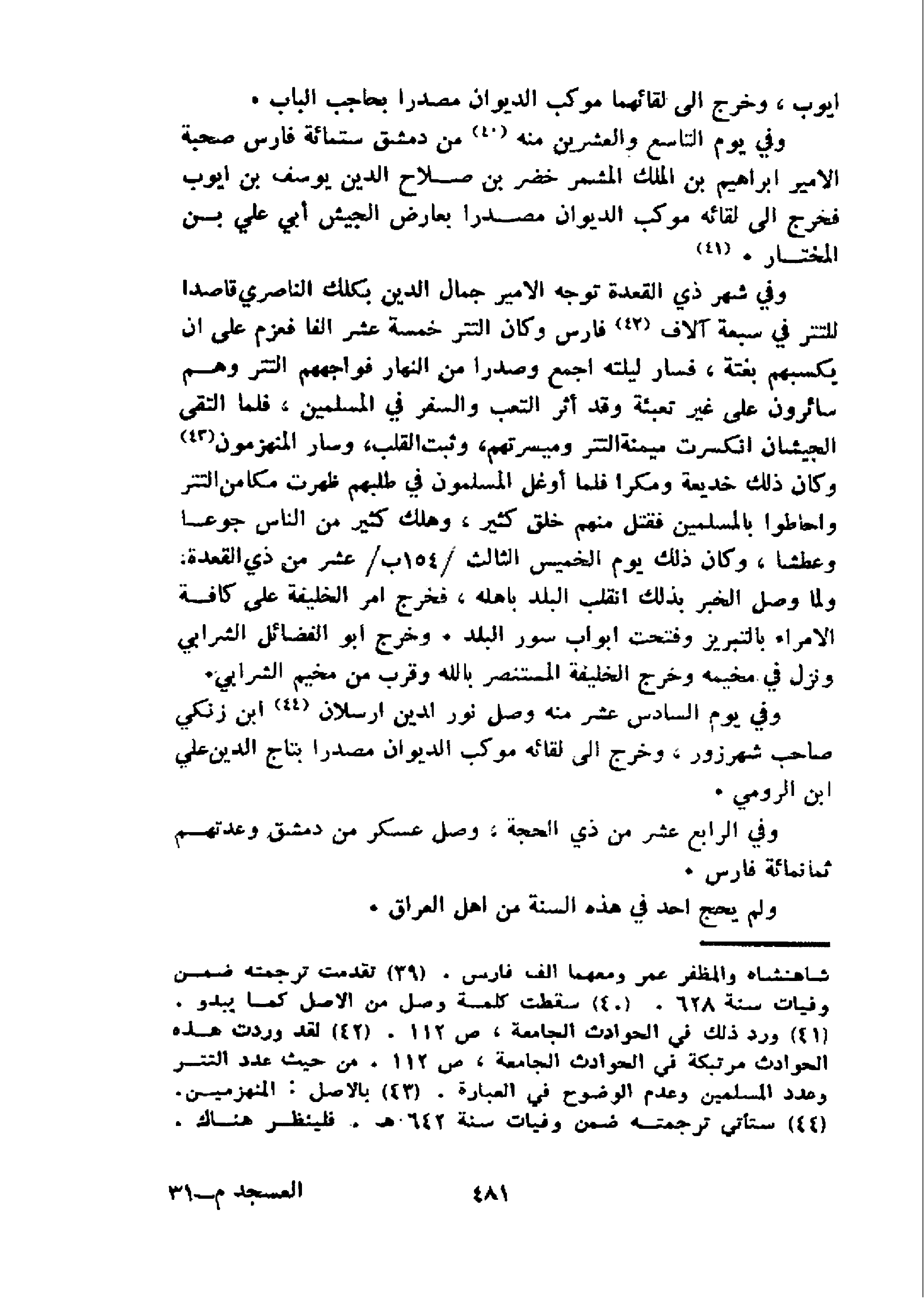 و في يوم التاسع والعشرين منه 40 من دمشق ستمائة فارس صحبة الامير ابراهيم بن الملك المشمر خضر بن صلاح الدين يوسف بن ايوب فحرج الى لقائه موكب الديوان مصدرا بعارض الجيش أبي علي بن المختار. 41