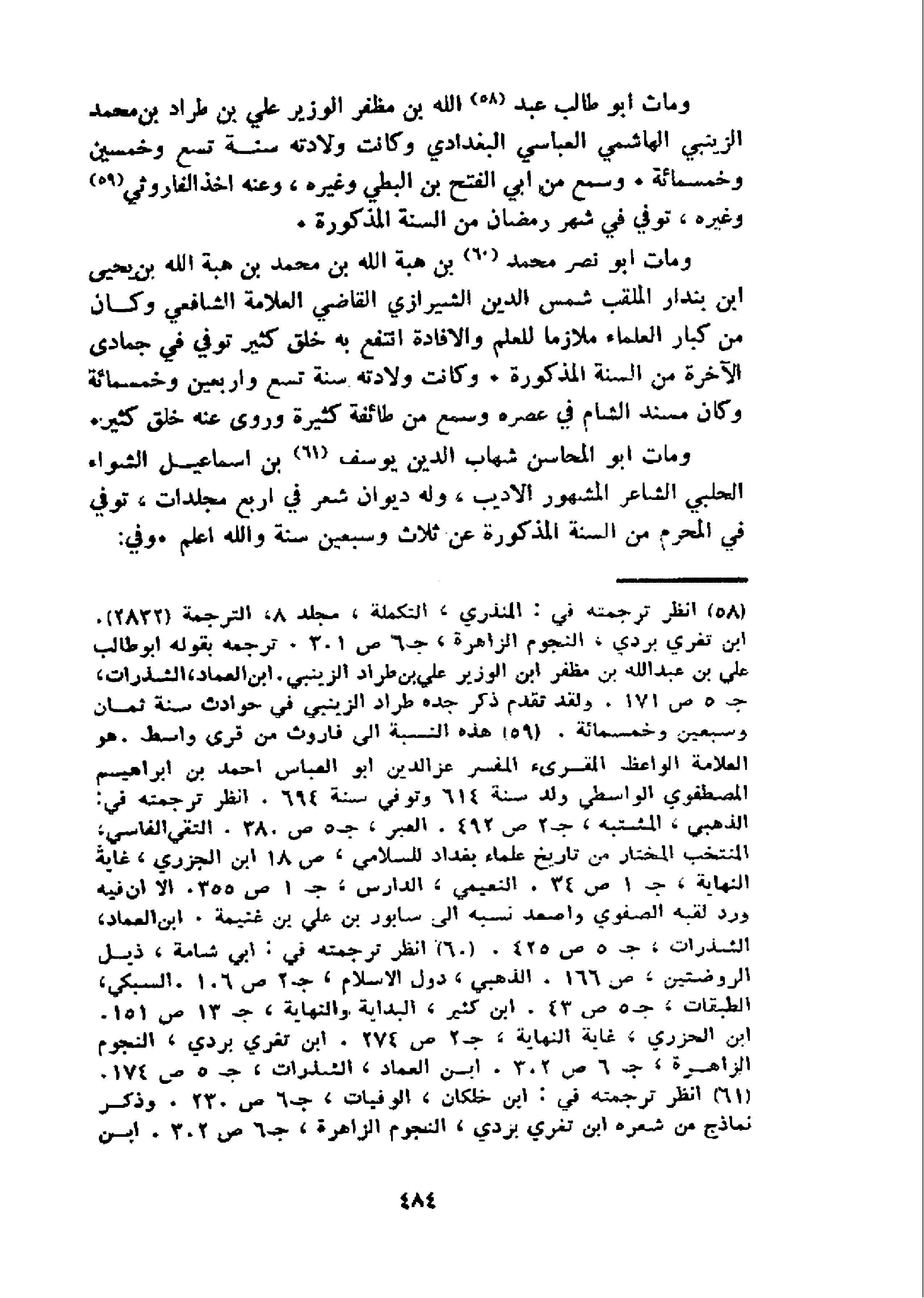 و مات ابو طالب عبد 58 الله بن مظفر الوزير علي بن طراد بن محمد الزينبي الهاشمي العباسي البغدادي وكانت ولادته سنة تسع وخمسين وخمسمائة. وسمع من ابي الفتح بن البطي وغيره، وعنه اخذ الفاروثي 59 و غيره، توفي في شهر رمضان من السنة المذكورة.