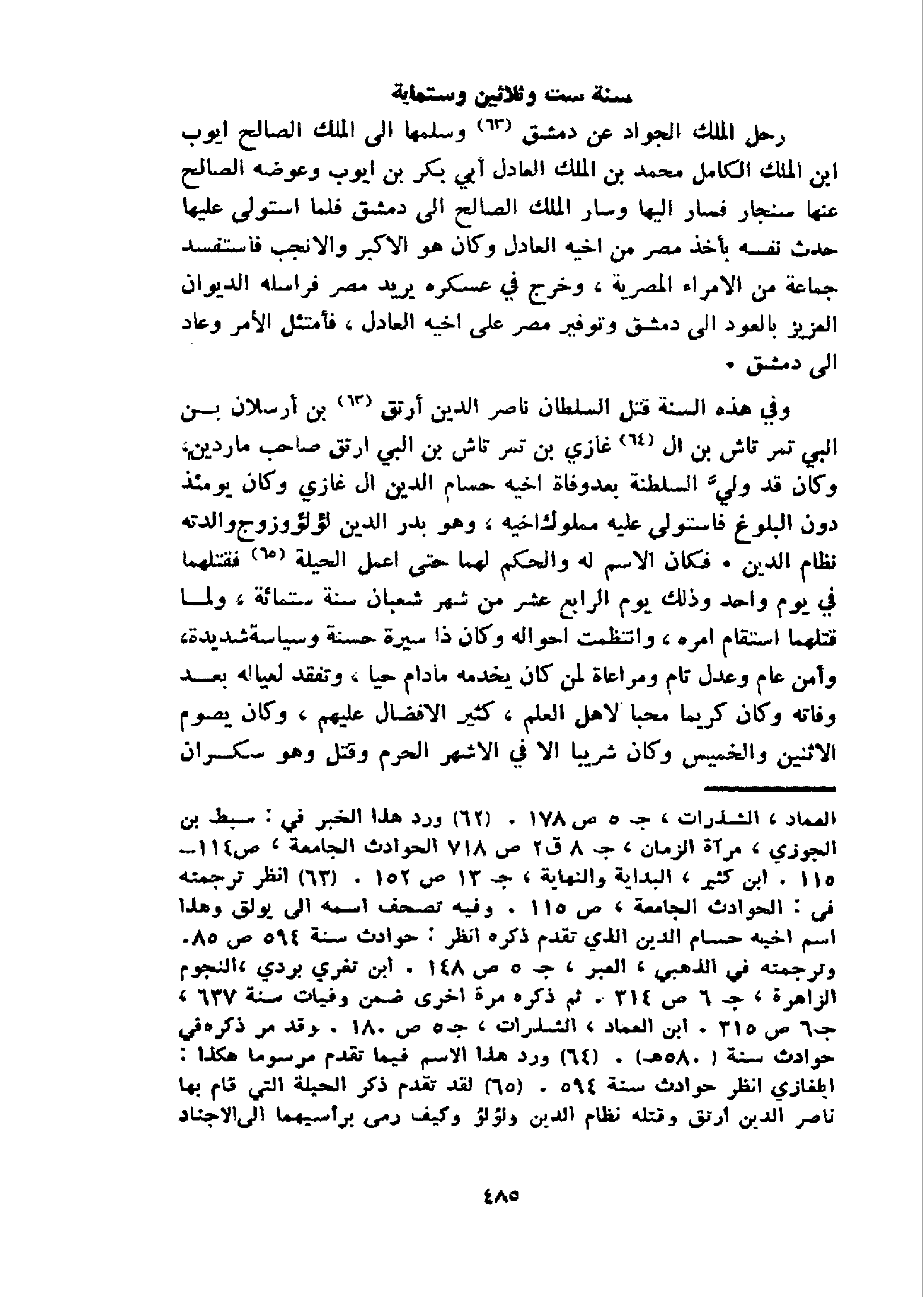 و في هذه السنة قتل السلطان ناصر الدين أرتق 63 بن أرسلان بن البي تمرتاش بن ال 64 غازي بن تمرتاش بن البي ارتق صاحب ماردين، وكان قد وليّ السلطنة بعد وفاة اخيه حسام الدين ال غازي وكان يومئذ دون البلوغ فاستولى عليه مملوك اخيه، وهو بدر الدين لؤلؤ وزوج والدته نظام الدين. فكان الاسم له والحكم لهما حتى اعمل الحيلة 65 فقتلهما في يوم واحد وذلك يوم الرابع عشر من شهر شعبان سنة ستمائة، ولما قتلهما استقام امره، وانتظمت احواله وكان ذا سيرة حسنة وسياسة شديدة، وأمن عام وعدل تام ومراعاة لمن كان يخدمه مادام حيا، وتفقد لعياله بعد وفاته وكان كريما محبا لاهل العلم، كثير الافضال عليهم، وكان يصوم الاثنين والخميس وكان شريبا الا في الاشهر الحرم وقتل وهو سكران