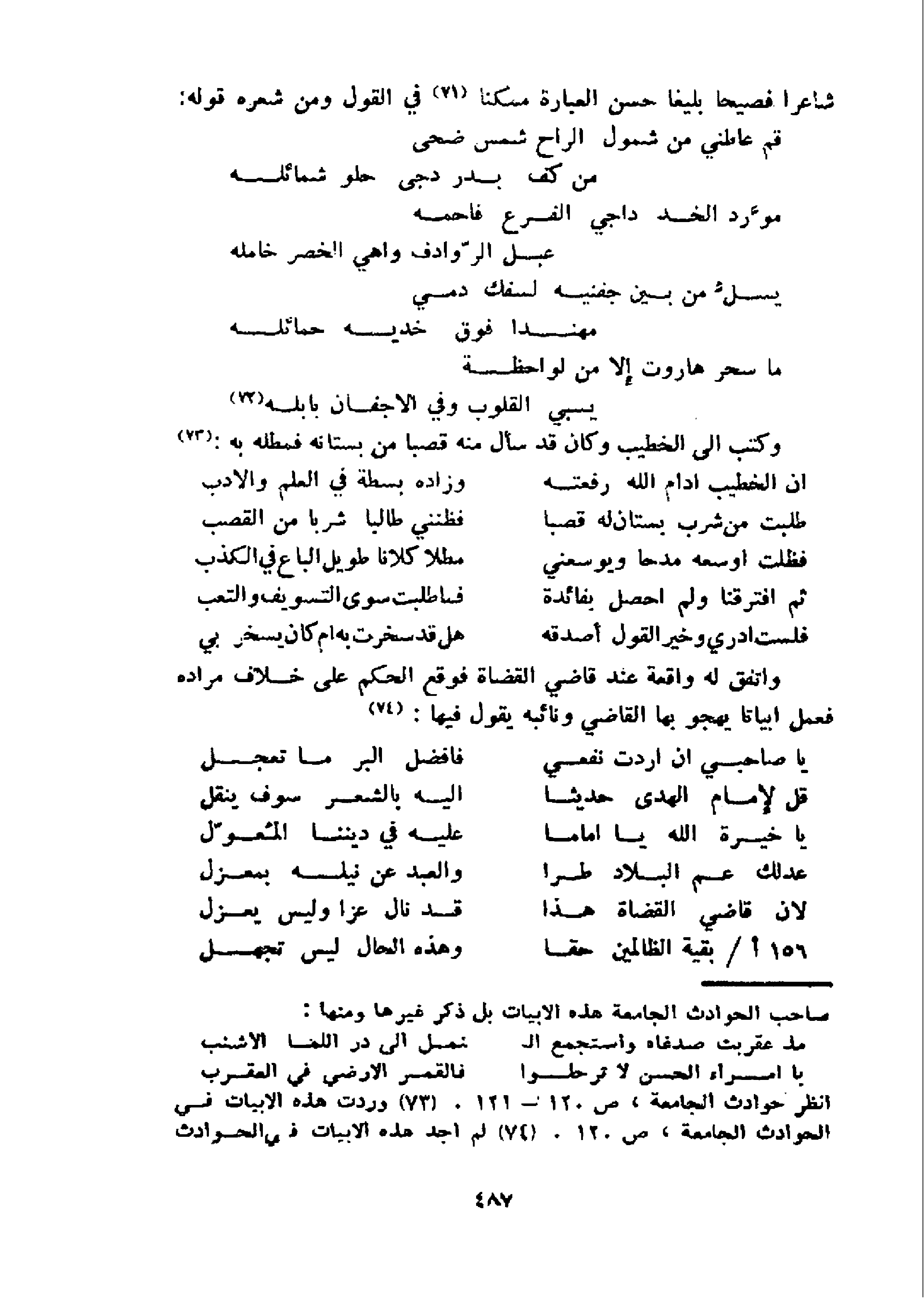 واتفق له واقعة عند قاضي القضاة فوقع الحكم على خلاف مراده فعمل ابياتا يهجو بها القاضي ونائبه يقول فيها: 74