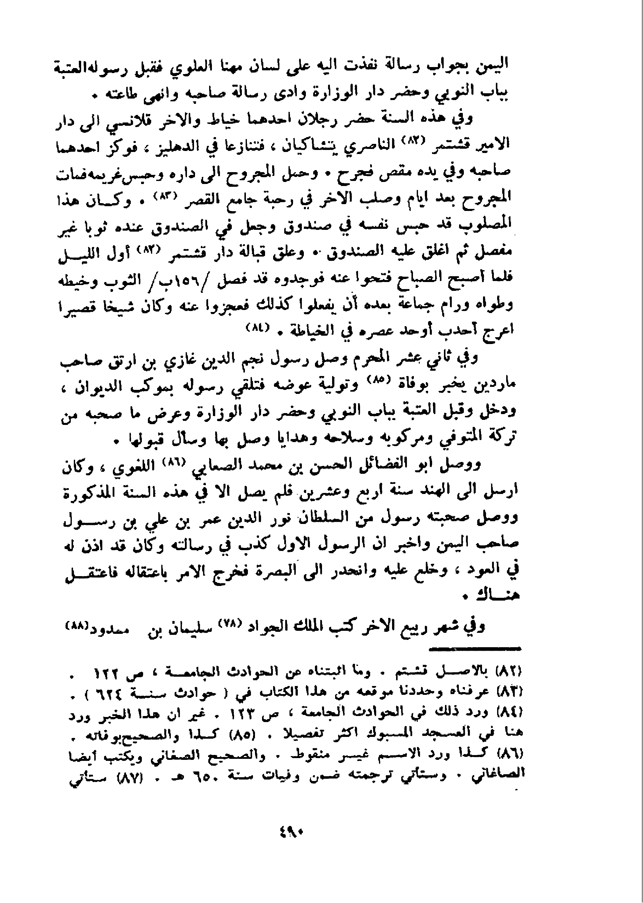 و وصل ابو الفضائل الحسن بن محمد الصعابي 86 اللغوي، وكان ارسل الى الهند سنة اربع وعشرين فلم يصل الا في هذه السنة المذكورة ووصل صحبته رسول من السلطان نور الدين عمر بن علي بن رسول صاحب اليمن واخبر ان الرسول الاول كذب في رسالته وكان قد اذن له في العود، وخلع عليه وانحدر الى البصرة فخرج الامر باعتقاله فاعتقل هناك.
