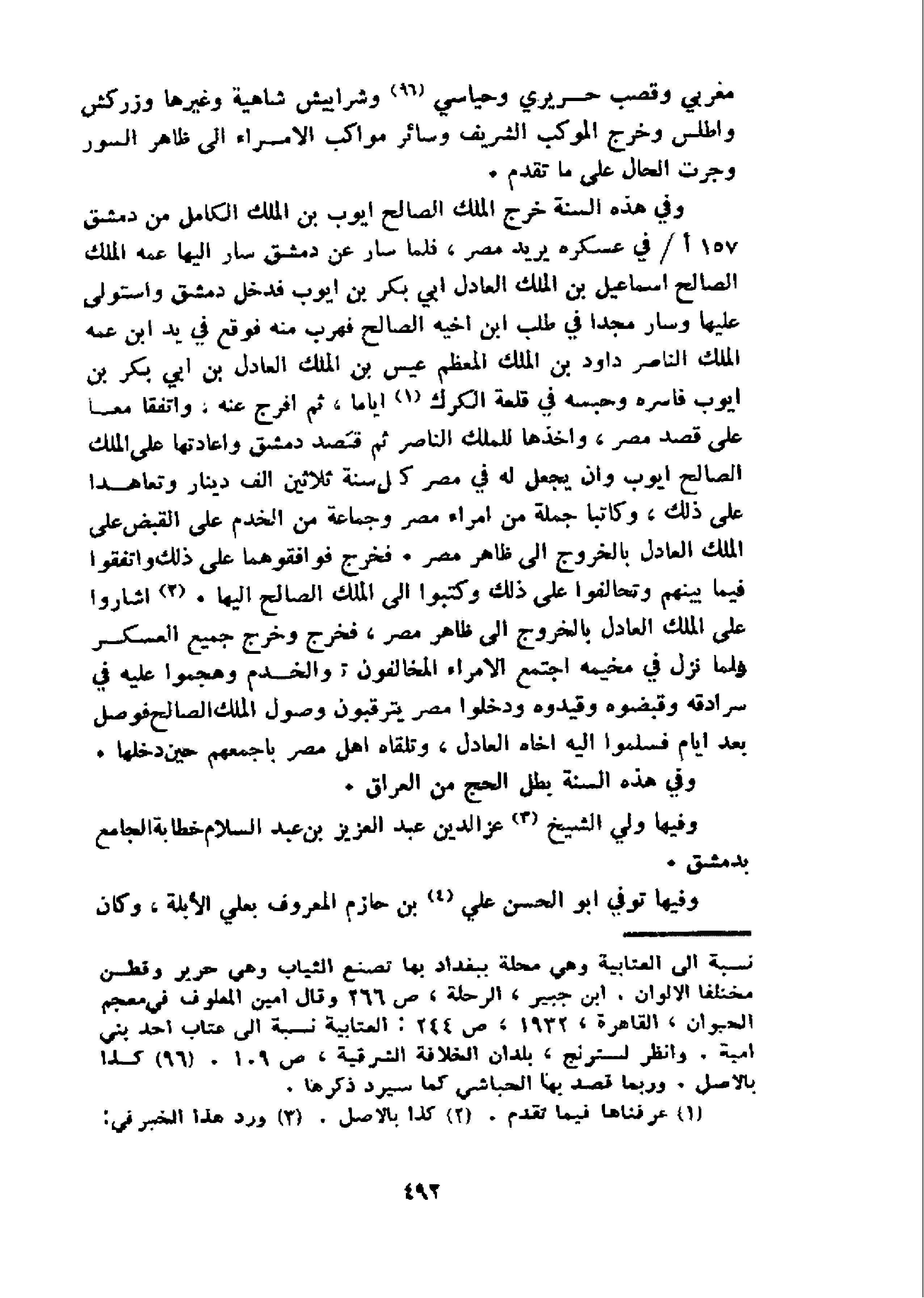 و في هذه السنة خرج الملك الصالح ايوب بن الملك الكامل من دمشق 157 أ/في عسكره يريد مصر، فلما سار عن دمشق سار اليها عمه الملك الصالح اسماعيل بن الملك العادل ابي بكر بن ايوب فدخل دمشق واستولى عليها وسار مجدا في طلب ابن اخيه الصالح فهرب منه فوقع في يد ابن عمه الملك الناصر داود بن الملك المعظم عيس بن الملك العادل بن ابي بكر بن ايوب فاسره وحبسه في قلعة الكرك 1 اياما، ثم افرج عنه، واتفقا معا على قصد مصر، واخذها للملك الناصر ثم قصد دمشق واعادتها على الملك الصالح ايوب وان يجعل له في مصر كل سنة ثلاثين الف دينار وتعاهدا على ذلك، وكاتبا جملة من امراء مصر وجماعة من الخدم على القبض على الملك العادل بالخروج الى ظاهر مصر. فخرج فوافقوهما على ذلك واتفقوا فيما بينهم وتحالفوا على ذلك وكتبوا الى الملك الصالح اليها. 2 اشاروا على الملك العادل بالخروج الى ظاهر مصر، فخرج وخرج جميع العسكر فلما نزل في مخيمه اجتمع الامراء المخالفون والخدم وهجموا عليه في سرادقه وقبضوه وقيدوه ودخلوا مصر يترقبون وصول الملك الصالح فوصل بعد ايام فسلموا اليه اخاه العادل، وتلقاه اهل مصر باجمعهم حين دخلها.
