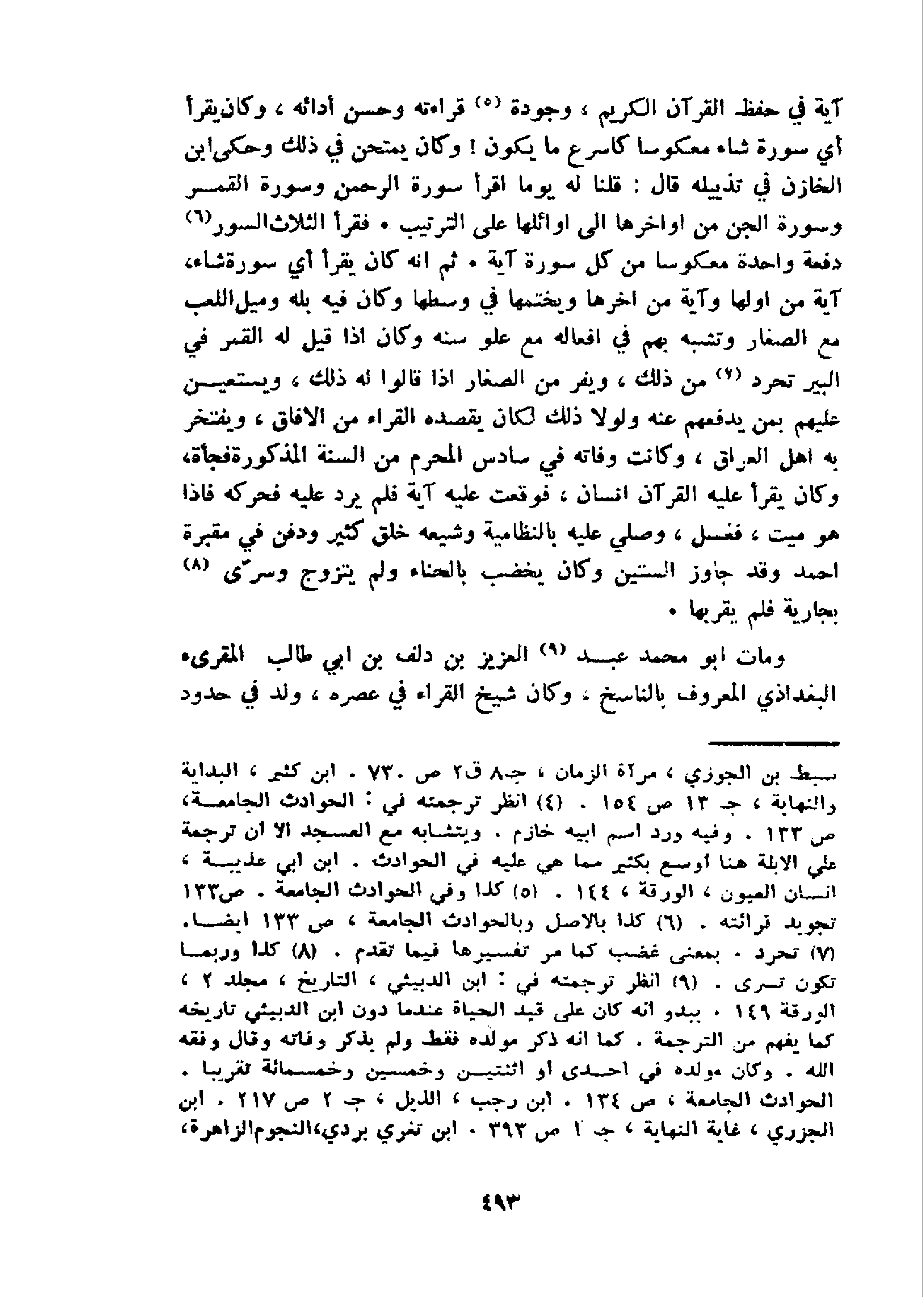 آية في حفظ القرآن الكريم، وجودة 5 قراءته وحسن أدائه، وكان يقرأ أي سورة شاء معكوسا كاسرع ما يكون! وكان يمتحن في ذلك وحكى ابن الخازن في تذييله قال: قلنا له يوما اقرأ سورة الرحمن وسورة القمر وسورة الجن من اواخرها الى اوائلها على الترتيب. فقرأ الثلاث السور 6 دفعة واحدة معكوسا من كل سورة آية. ثم انه كان يقرأ أي سورة شاء، آية من اولها وآية من اخرها ويختمها في وسطها وكان فيه بله وميل اللعب مع الصغار وتشبه بهم في افعاله مع علو سنه وكان اذا قيل له القمر في البير تحرد 7 من ذلك، ويفر من الصغار اذا قالوا له ذلك، ويستعين عليهم بمن يدفعهم عنه ولولا ذلك لكان يقصده القراء من الافاق، ويفتخر به اهل العراق، وكانت وفاته في سادس المحرم من السنة المذكورة فجأة، وكان يقرأ عليه القرآن انسان، فوقعت عليه آية فلم يرد عليه فحركه فاذا هو ميت، فغسل، وصلي عليه بالنظامية وشيعه خلق كثير ودفن في مقبرة احمد وقد جاوز الستين وكان يخضب بالحناء ولم يتزوج وسرّى 8 بجارية فلم يقربها.