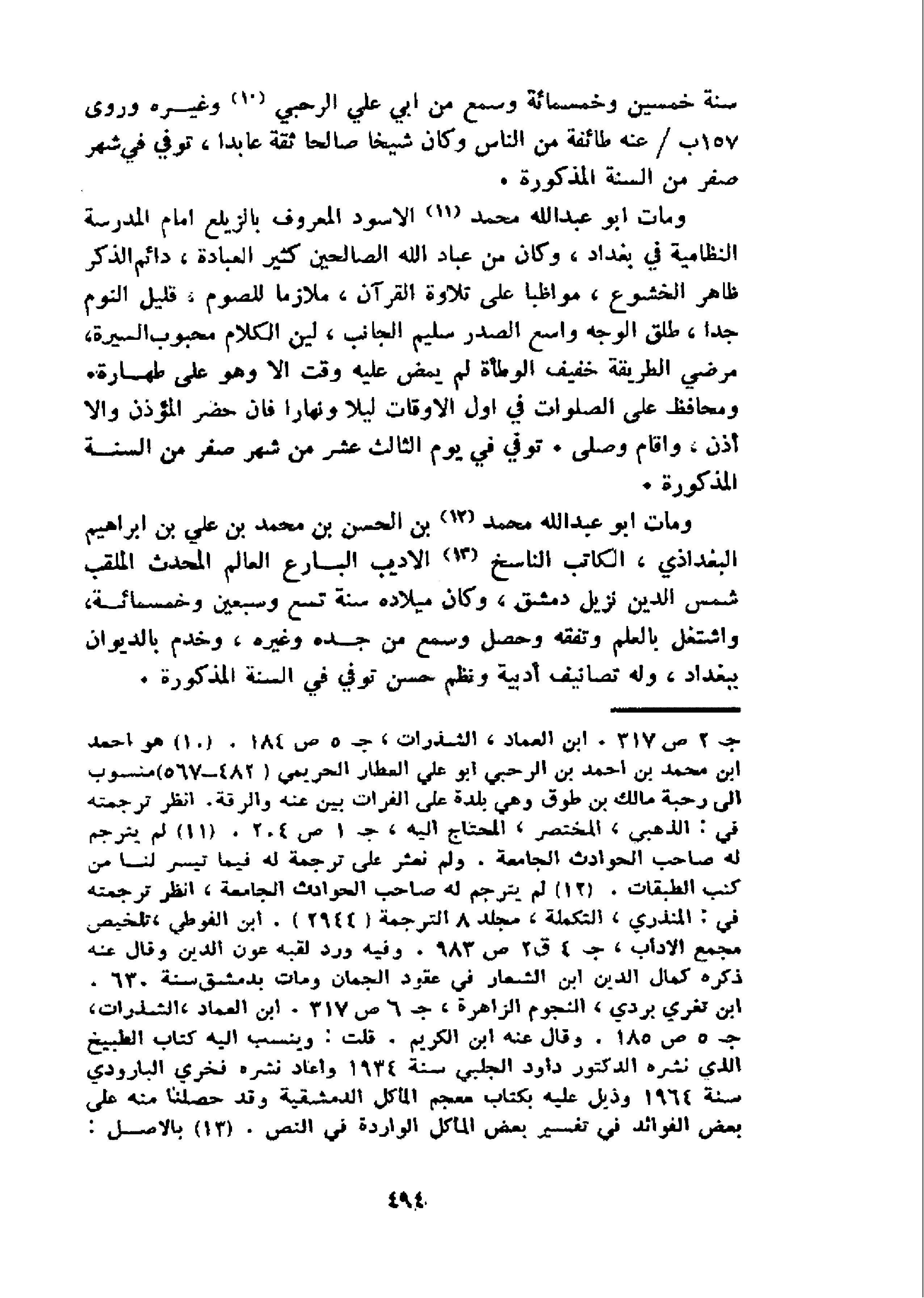 و مات ابو عبد الله محمد 12 بن الحسن بن محمد بن علي بن ابراهيم البغداذي، الكاتب الناسخ 13 الاديب البارع العالم المحدث الملقب شمس الدين نزيل دمشق، وكان ميلاده سنة تسع وسبعين وخمسمائة، واشتغل بالعلم وتفقه وحصل وسمع من جده وغيره، وخدم بالديوان ببغداد، وله تصانيف أدبية ونظم حسن توفي في السنة المذكورة.
