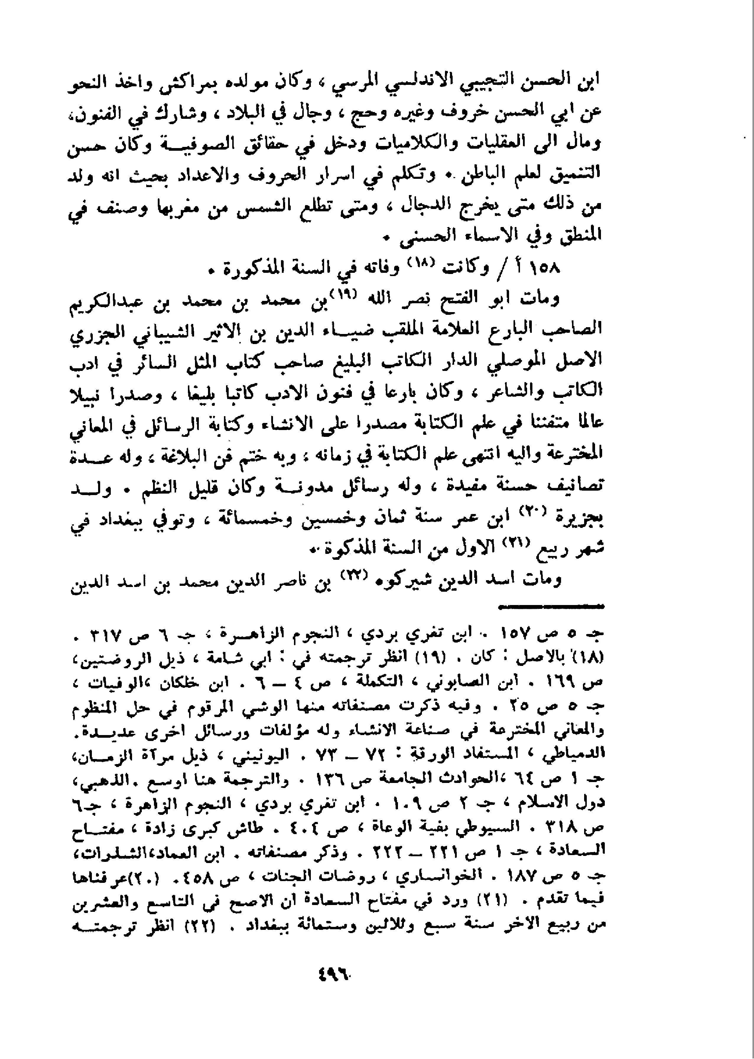 و مات ابو الفتح نصر الله 19 بن محمد بن محمد بن عبد الكريم الصاحب البارع العلامة الملقب ضياء الدين بن الاثير الشيباني الجزري الاصل الموصلي الدار الكاتب البليغ صاحب كتاب المثل السائر في ادب الكاتب والشاعر، وكان بارعا في فنون الادب كاتبا بليغا، وصدرا نبيلا عالما متفننا في علم الكتابة مصدرا على الانشاء وكتابة الرسائل في المعاني المخترعة واليه انتهى علم الكتابة في زمانه، وبه ختم فن البلاغة، وله عدة تصانيف حسنة مفيدة، وله رسائل مدونة وكان قليل النظم. ولد بجزيرة 20 ابن عمر سنة ثمان وخمسين وخمسمائة، وتوفي ببغداد في شهر ربيع 21 الاول من السنة المذكورة.