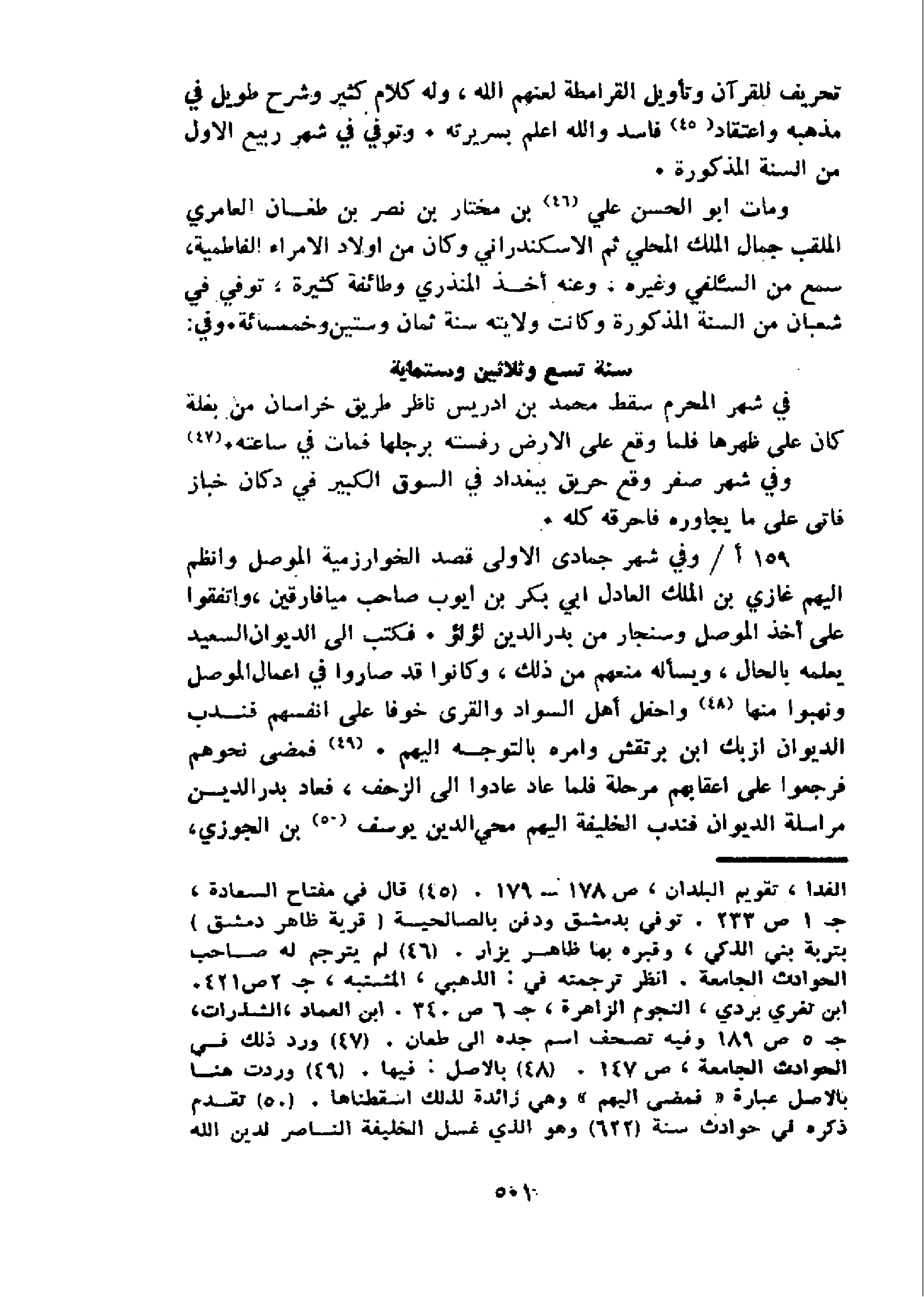 159 أ/وفي شهر جمادى الاولى قصد الخوارزمية الموصل وانظم اليهم غازي بن الملك العادل ابي بكر بن ايوب صاحب ميافارقين، واتفقوا على أخذ الموصل وسنجار من بدر الدين لؤلؤ. فكتب الى الديوان السعيد يعلمه بالحال، ويسأله منعهم من ذلك، وكانوا قد صاروا في اعمال الموصل ونهبوا منها 48 و احفل أهل السواد والقرى خوفا على انفسهم فندب الديوان ازبك ابن برتقش وامره بالتوجه اليهم. 49 فمضى نحوهم فرجعوا على اعقابهم مرحلة فلما عاد عادوا الى الزحف، فعاد بدر الدين مراسلة الديوان فندب الخليفة اليهم محي الدين يوسف 50 بن الجوزي،