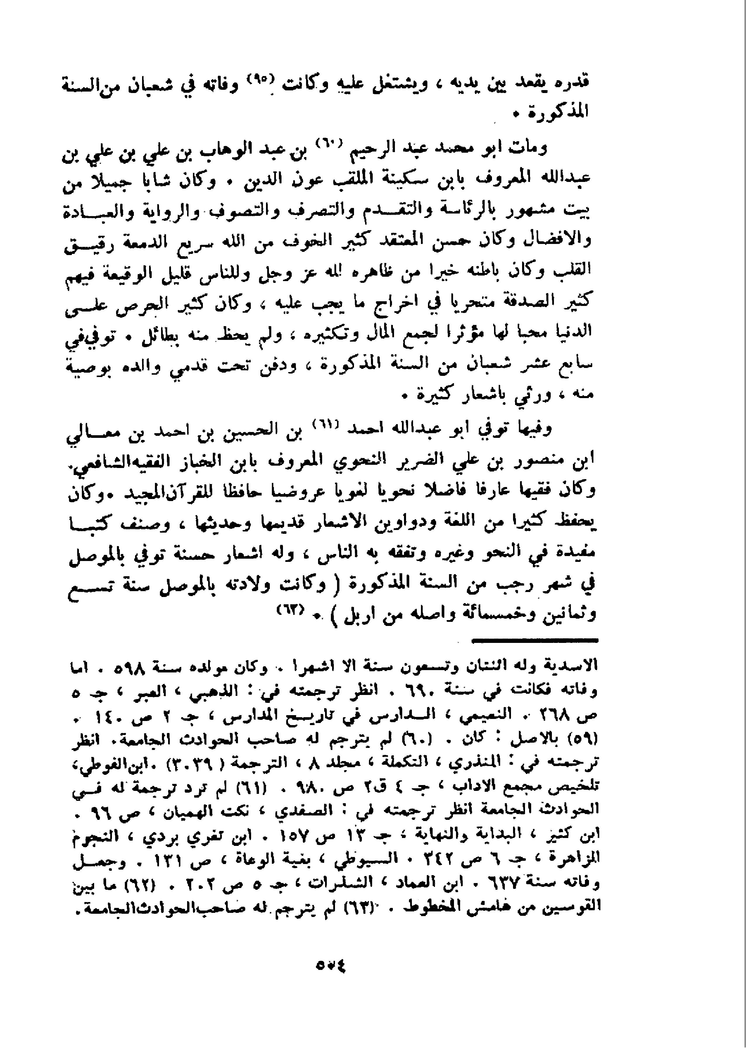 و مات ابو محمد عبد الرحيم 60 بن عبد الوهاب بن علي بن علي بن عبد الله المعروف بابن سكينة الملقب عون الدين. وكان شابا جميلا من بيت مشهور بالرئاسة والتقدم والتصرف والتصوف والرواية والعبادة والافضال وكان حسن المعتقد كثير الخوف من الله سريع الدمعة رقيق القلب وكان باطنه خيرا من ظاهره لله عز وجل وللناس قليل الوقيعة فيهم كثير الصدقة متحريا في اخراج ما يجب عليه، وكان كثير الحرص على الدنيا محبا لها مؤثرا لجمع المال وتكثيره، ولم يحظ منه بطائل. توفي في سابع عشر شعبان من السنة المذكورة، ودفن تحت قدمي والده بوصية منه، ورثي باشعار كثيرة.