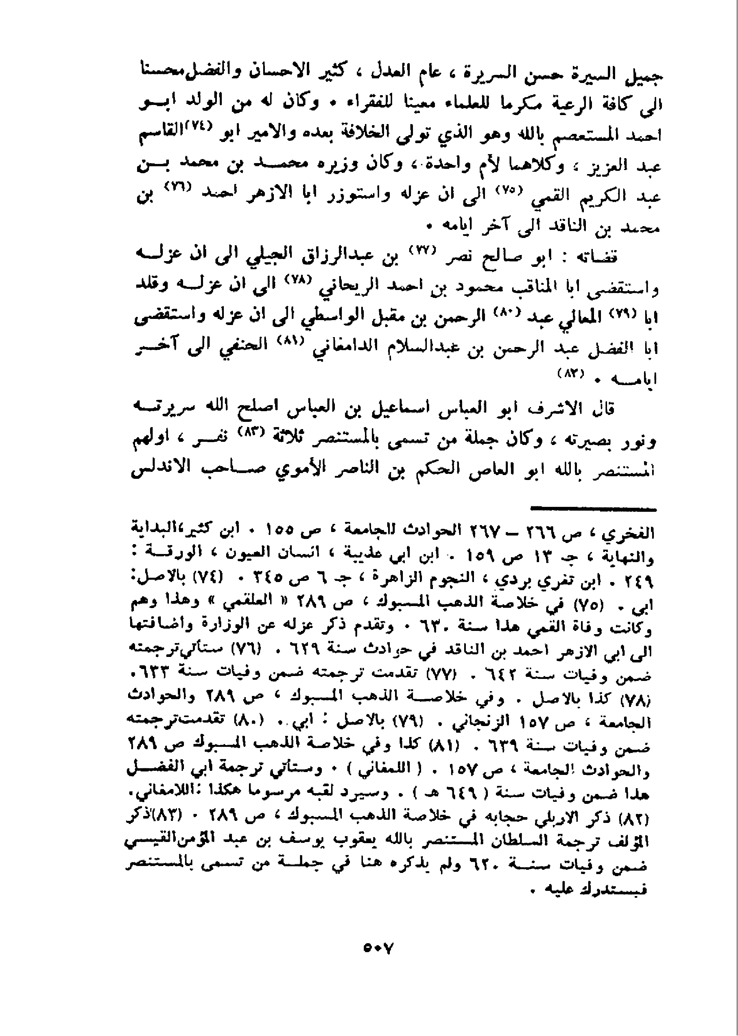 جميل السيرة حسن السريرة، عام العدل، كثير الاحسان والفضل محسنا الى كافة الرعية مكرما للعلماء معينا للفقراء. وكان له من الولد ابو احمد المستعصم بالله وهو الذي تولى الخلافة بعده والامير ابو 74 القاسم عبد العزيز، وكلاهما لأم واحدة، وكان وزيره محمد بن محمد بن عبد الكريم القمي 75 الى ان عزله واستوزر ابا الازهر احمد 76 بن محمد بن الناقد الى آخر ايامه.