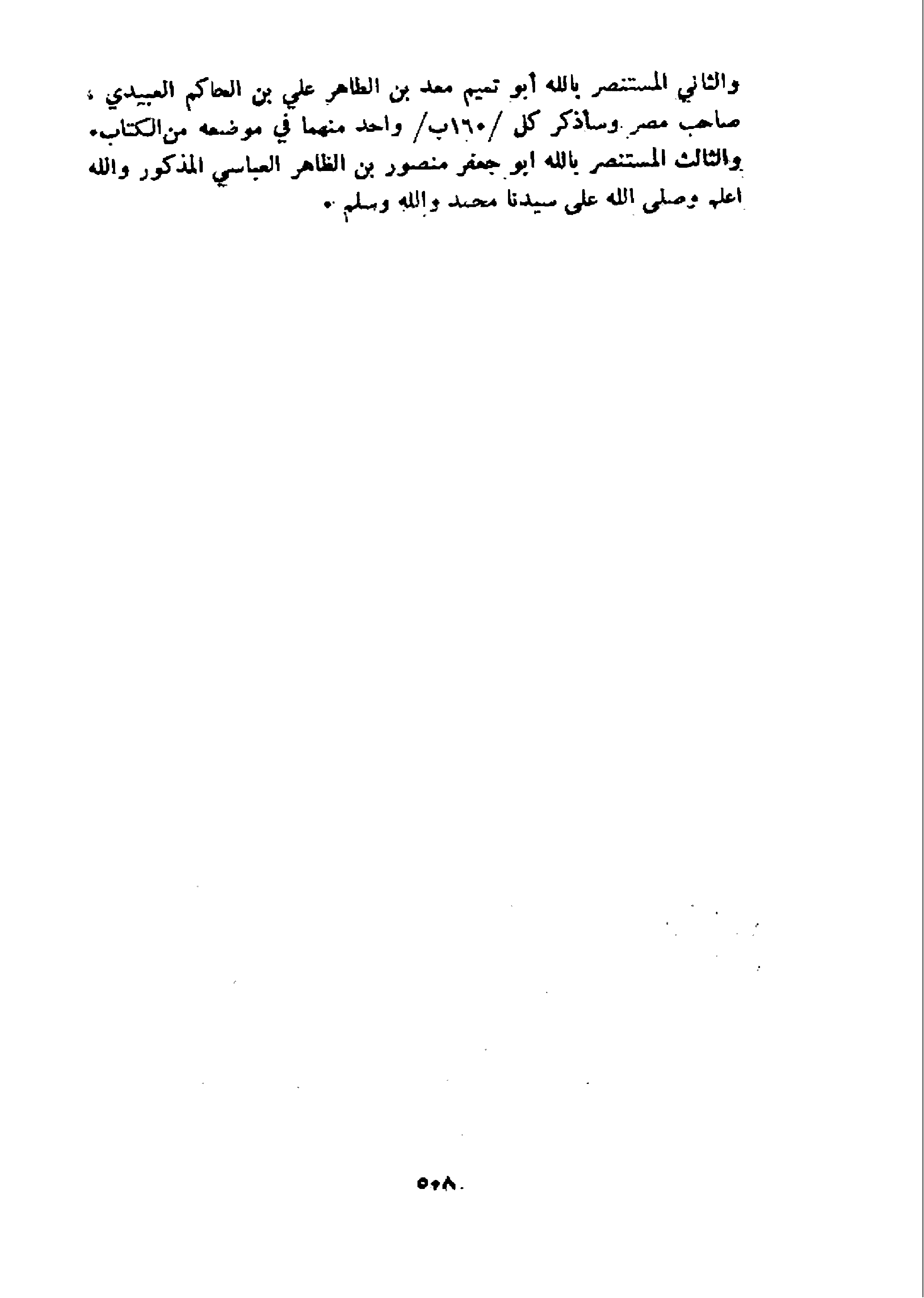 و الثالث المستنصر بالله ابو جعفر منصور بن الظاهر العباسي المذكور والله اعلم وصلى الله على سيدنا محمد والله وسلم.