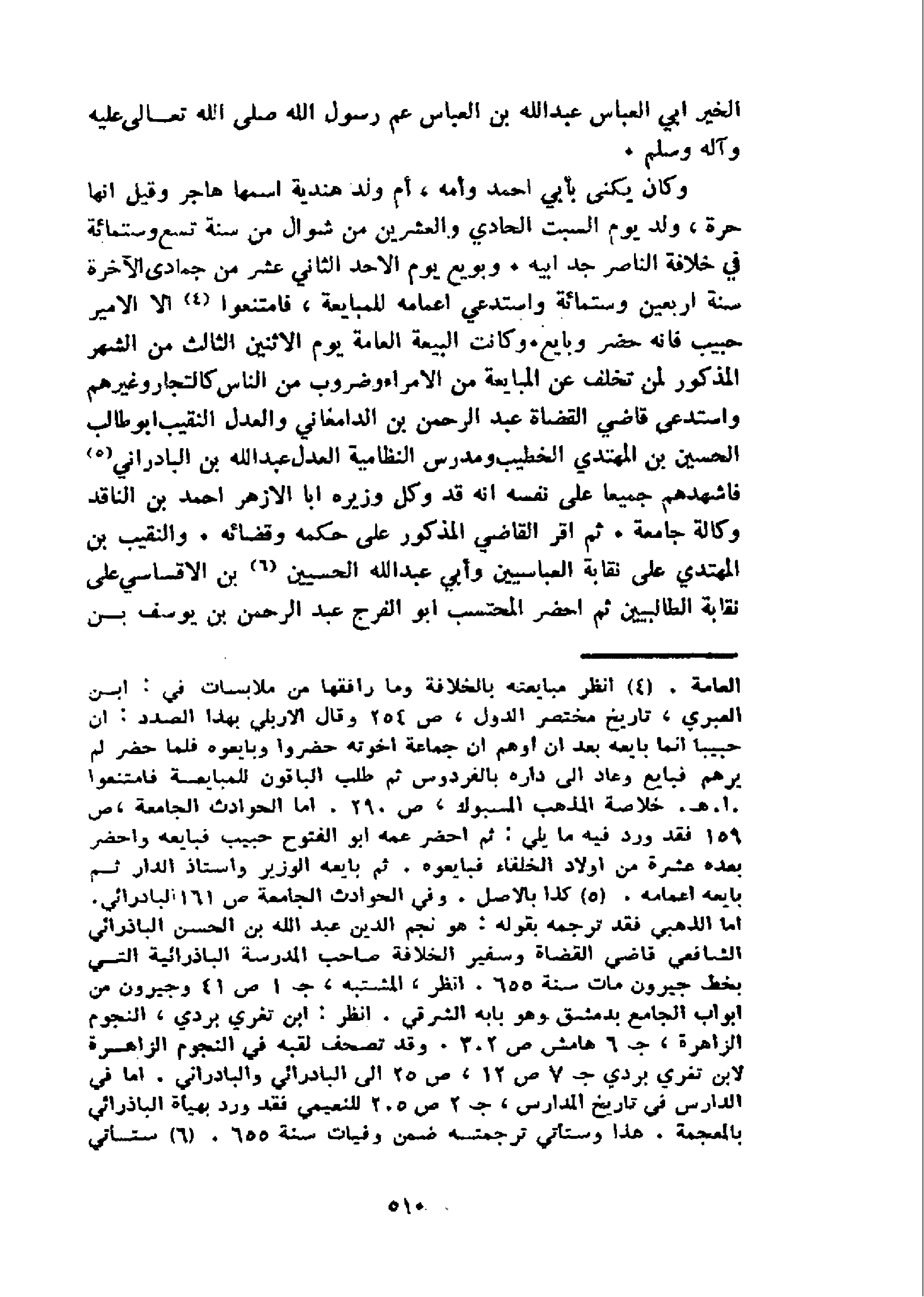و كان يكنى بأبي احمد وأمه، أم ولد هندية اسمها هاجر وقيل انها حرة، ولد يوم السبت الحادي والعشرين من شوال من سنة تسع وستمائة في خلافة الناصر جد ابيه. وبويع يوم الاحد الثاني عشر من جمادى الآخرة سنة اربعين وستمائة واستدعي اعمامه للمبايعة، فامتنعوا 4 الا الامير حبيب فانه حضر وبايع. وكانت البيعة العامة يوم الاثنين الثالث من الشهر المذكور لمن تخلف عن المبايعة من الامراء وضروب من الناس كالتجار وغيرهم واستدعى قاضي القضاة عبد الرحمن بن الدامغاني والعدل النقيب ابو طالب الحسين بن المهتدي الخطيب ومدرس النظامية العدل عبد الله بن البادراني 5 فاشهدهم جميعا على نفسه انه قد وكل وزيره ابا الازهر احمد بن الناقد وكالة جامعة. ثم اقر القاضي المذكور على حكمه وقضائه. والنقيب بن المهتدي على نقابة العباسيين وأبي عبد الله الحسين 6 بن الاقساسي على نقابة الطالبيين ثم احضر المحتسب ابو الفرج عبد الرحمن بن يوسف بن