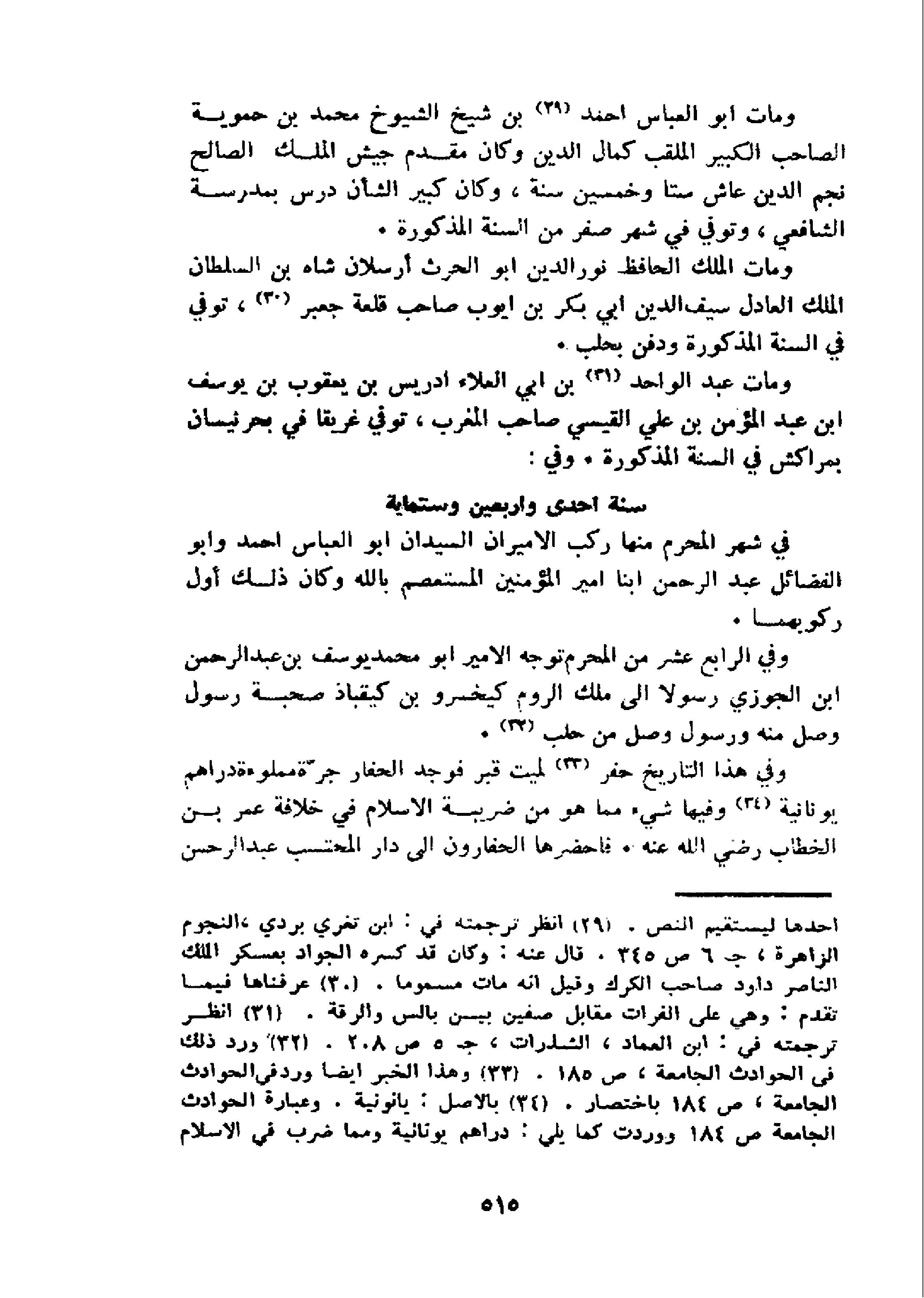 و مات ابو العباس احمد 29 بن شيخ الشيوخ محمد بن حموية الصاحب الكبير الملقب كمال الدين وكان مقدم جيش الملك الصالح نجم الدين عاش ستا وخمسين سنة، وكان كبير الشأن درس بمدرسة الشافعي، وتوفي في شهر صفر من السنة المذكورة.