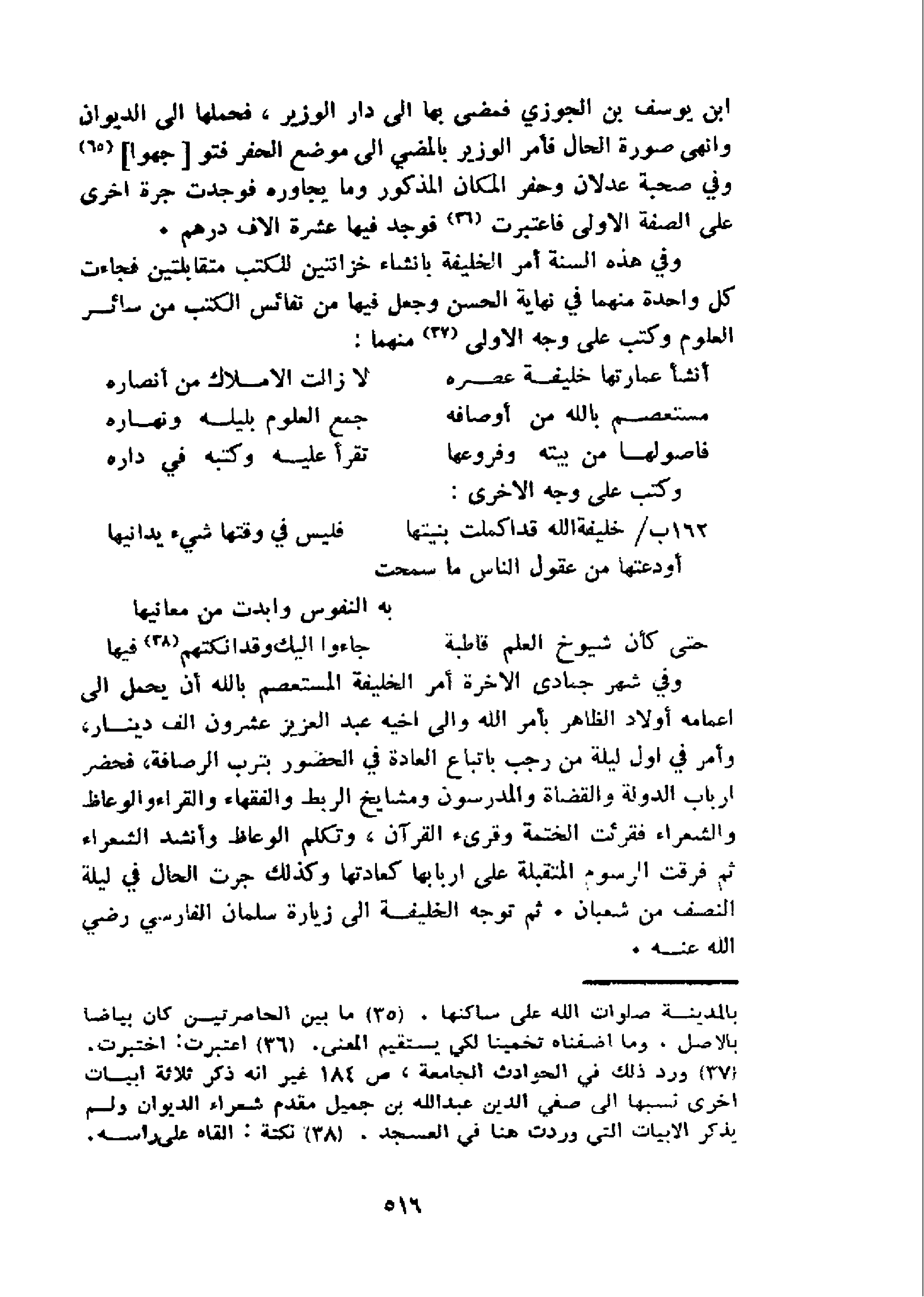 و في هذه السنة أمر الخليفة بانشاء خزانتين للكتب متقابلتين فجاءت كل واحدة منهما في نهاية الحسن وجعل فيها من نفائس الكتب من سائر العلوم وكتب على وجه الاولى 37 منهما:
