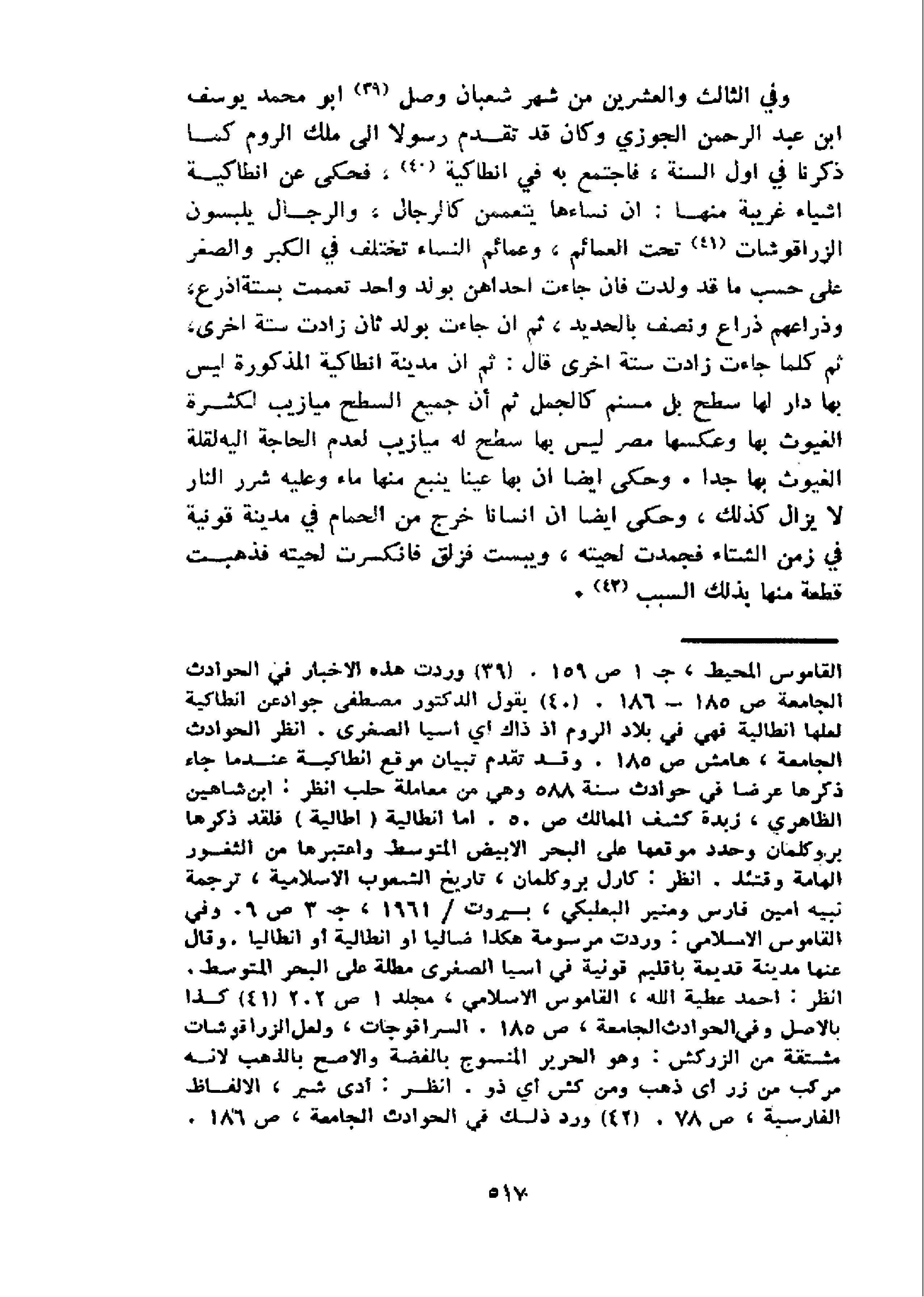 و في الثالث والعشرين من شهر شعبان وصل 39 ابو محمد يوسف ابن عبد الرحمن الجوزي وكان قد تقدم رسولا الى ملك الروم كما ذكرنا في اول السنة، فاجتمع به في انطاكية 40، فحكى عن انطاكية اشياء غريبة منها: ان نساءها يتعممن كالرجال، والرجال يلبسون الزراقوشات 41 تحت العمائم، وعمائم النساء تختلف في الكبر والصغر على حسب ما قد ولدت فان جاءت احداهن بولد واحد تعممت بستة اذرع، وذراعهم ذراع ونصف بالحديد، ثم ان جاءت بولد ثان زادت ستة اخرى، ثم كلما جاءت زادت ستة اخرى قال: ثم ان مدينة انطاكية المذكورة ليس بها دار لها سطح بل مسنم كالجمل ثم أن جميع السطح ميازيب لكثرة الغيوث بها وعكسها مصر ليس بها سطح له ميازيب لعدم الحاجة اليه لقلة الغيوث بها جدا. وحكى ايضا ان بها عينا ينبع منها ماء وعليه شرر النار لا يزال كذلك، وحكى ايضا ان انسانا خرج من الحمام في مدينة قونية في زمن الشتاء فجمدت لحيته، ويبست فزلق فانكسرت لحيته فذهبت قطعة منها بذلك السبب 42.