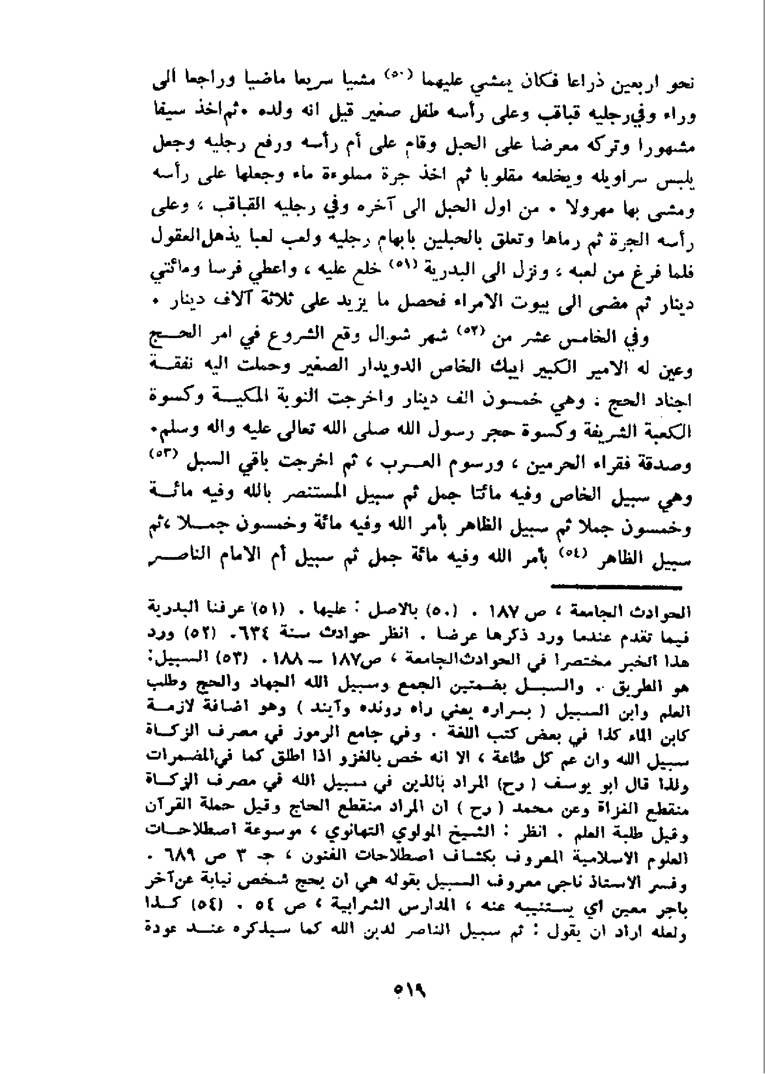 و صدقة فقراء الحرمين، ورسوم العرب، ثم اخرجت باقي السبل 53 و هي سبيل الخاص وفيه مائتا جمل ثم سبيل المستنصر بالله وفيه مائة وخمسون جملا ثم سبيل الظاهر بأمر الله وفيه مائة وخمسون جملا، ثم سبيل الظاهر 54 بأمر الله وفيه مائة جمل ثم سبيل أم الامام الناصر