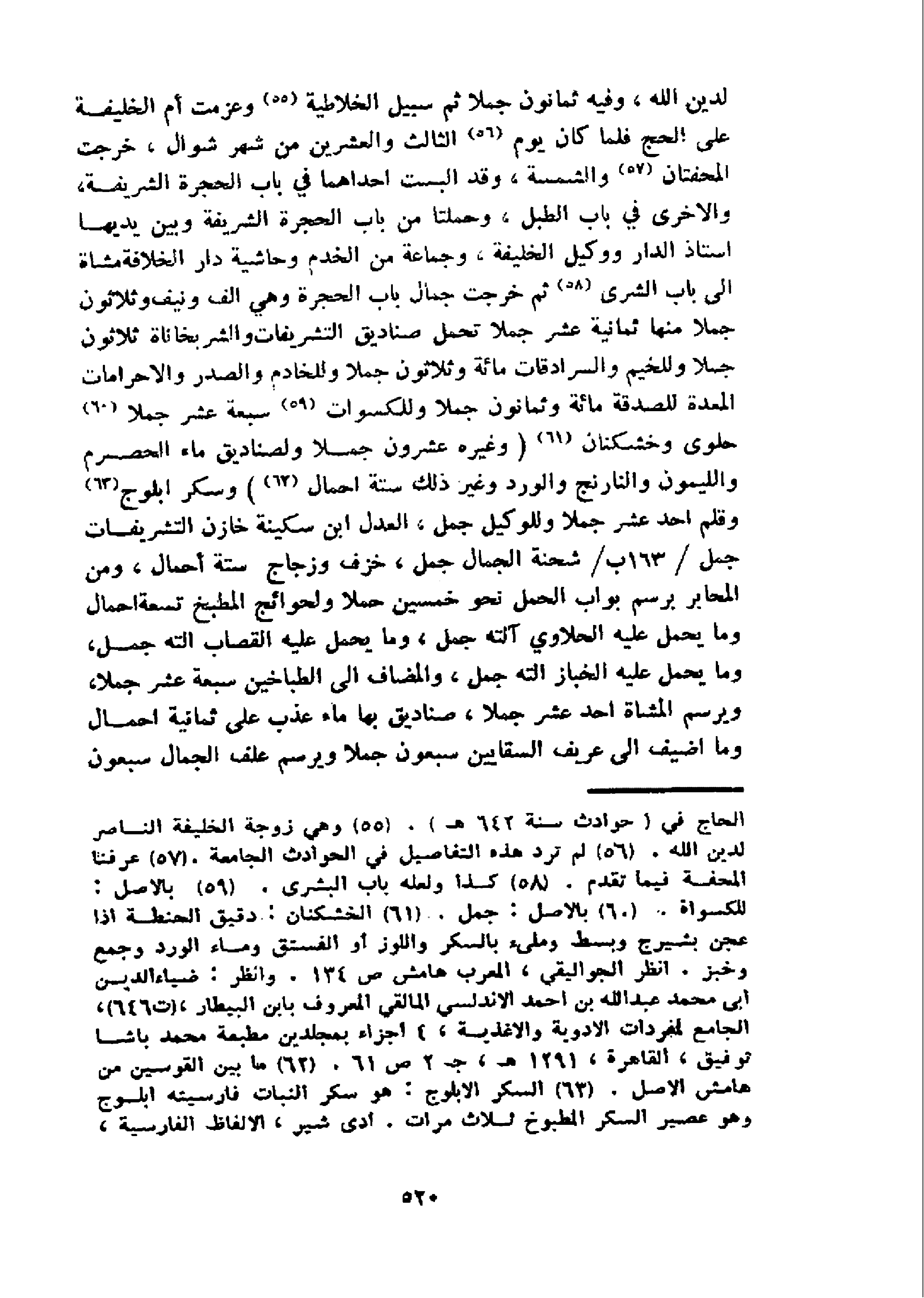لدين الله، وفيه ثمانون جملا ثم سبيل الخلاطية 55 و عزمت أم الخليفة على الحج فلما كان يوم 56 الثالث والعشرين من شهر شوال، خرجت المحفتان 57 و الشمسة، وقد البست احداهما في باب الحجرة الشريفة، والاخرى في باب الطبل، وحملتا من باب الحجرة الشريفة وبين يديها استاذ الدار ووكيل الخليفة، وجماعة من الخدم وحاشية دار الخلافة مشاة الى باب الشرى 58 ثم خرجت جمال باب الحجرة وهي الف ونيف وثلاثون جملا منها ثمانية عشر جملا تحمل صناديق التشريفات والشربخاناة ثلاثون جملا وللخيم والسرادقات مائة وثلاثون جملا وللخادم والصدر والاحرامات المعدة للصدقة مائة وثمانون جملا وللكسوات 59 سبعة عشر جملا 60 حلوى وخشكنان 61 (و غيره عشرون جملا ولصناديق ماء الحصرم والليمون والنارنج والورد وغير ذلك ستة احمال 62) وسكر ابلوج 63 و قلم احد عشر جملا وللوكيل جمل، العدل ابن سكينة خازن التشريفات جمل 163 / ب/شحنة الجمال جمل، خزف وزجاج ستة أحمال، ومن المحابر برسم بواب الحمل نحو خمسين حملا ولحوائج المطبخ تسعة احمال وما يحمل عليه الحلاوي آلته جمل، وما يحمل عليه القصاب الته جمل، وما يحمل عليه الخباز الته جمل، والمضاف الى الطباخين سبعة عشر جملا، ويرسم المشاة احد عشر جملا، صناديق بها ماء عذب على ثمانية احمال وما اضيف الى عريف السقايين سبعون جملا ويرسم علف الجمال سبعون