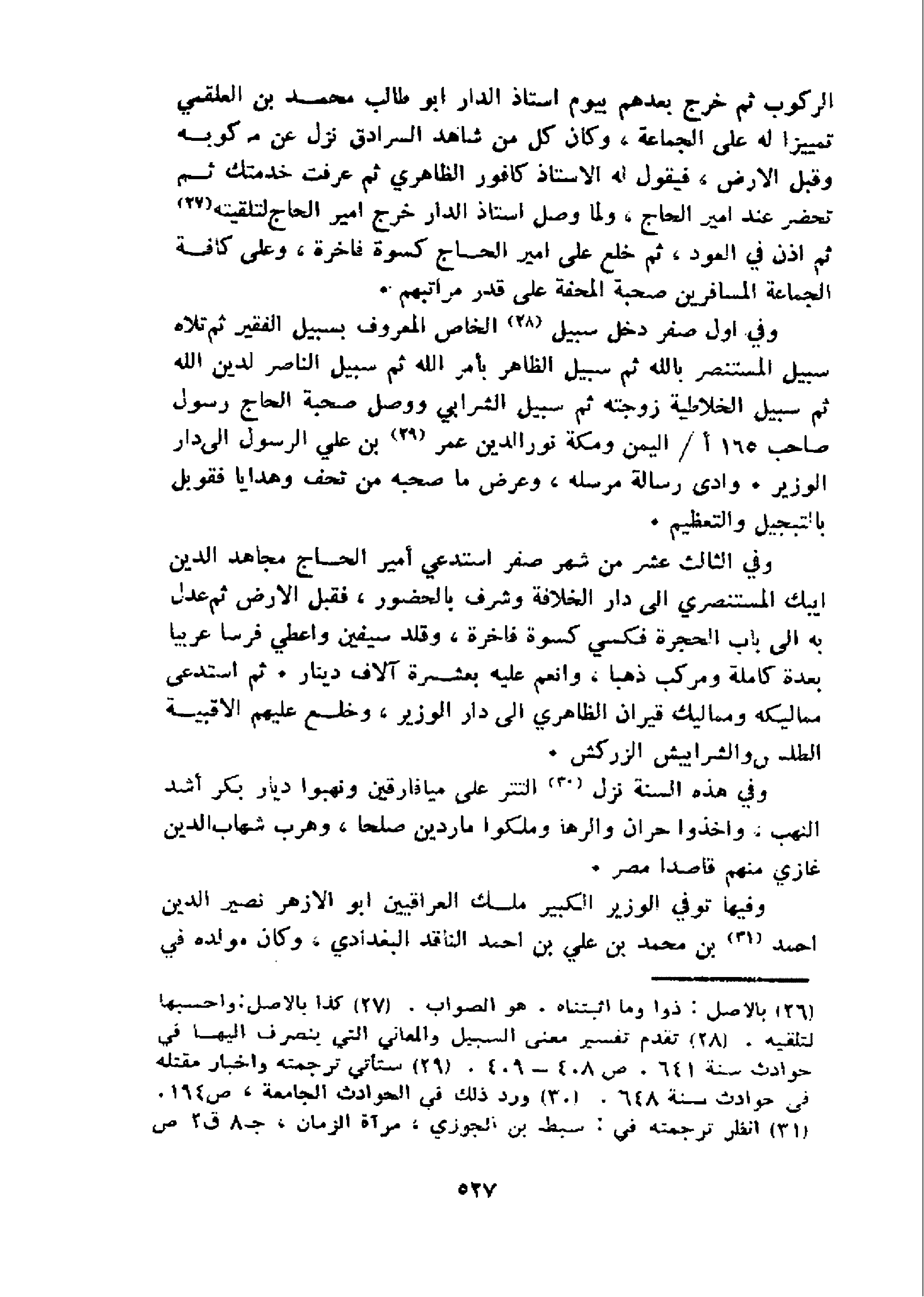 و في اول صفر دخل سبيل 28 الخاص المعروف بسبيل الفقير ثم تلاه سبيل المستنصر بالله ثم سبيل الظاهر بأمر الله ثم سبيل الناصر لدين الله ثم سبيل الخلاطية زوجته ثم سبيل الشرابي ووصل صحبة الحاج رسول صاحب 165 أ/اليمن ومكة نور الدين عمر 29 بن علي الرسول الى دار الوزير. وادى رسالة مرسله، وعرض ما صحبه من تحف وهدايا فقوبل بالتبجيل والتعظيم.