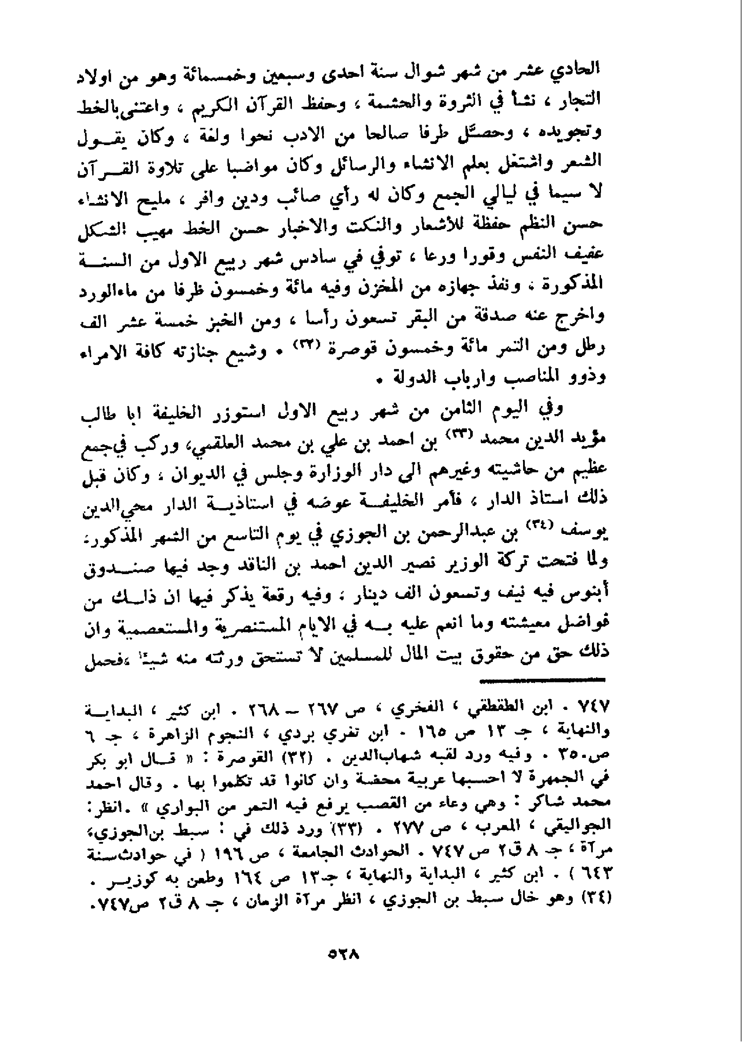 الحادي عشر من شهر شوال سنة احدى وسبعين وخمسمائة وهو من اولاد التجار، نشأ في الثروة والحشمة، وحفظ القرآن الكريم، واعتنى بالخط وتجويده، وحصّل طرفا صالحا من الادب نحوا ولغة، وكان يقول الشعر واشتغل بعلم الانشاء والرسائل وكان مواضبا على تلاوة القرآن لا سيما في ليالي الجمع وكان له رأي صائب ودين وافر، مليح الانشاء حسن النظم حفظة للأشعار والنكت والاخبار حسن الخط مهيب الشكل عفيف النفس وقورا ورعا، توفي في سادس شهر ربيع الاول من السنة المذكورة، ونفذ جهازه من المخزن وفيه مائة وخمسون ظرفا من ماء الورد واخرج عنه صدقة من البقر تسعون رأسا، ومن الخبز خمسة عشر الف رطل ومن التمر مائة وخمسون قوصرة 32.و شيع جنازته كافة الامراء وذوو المناصب وارباب الدولة.