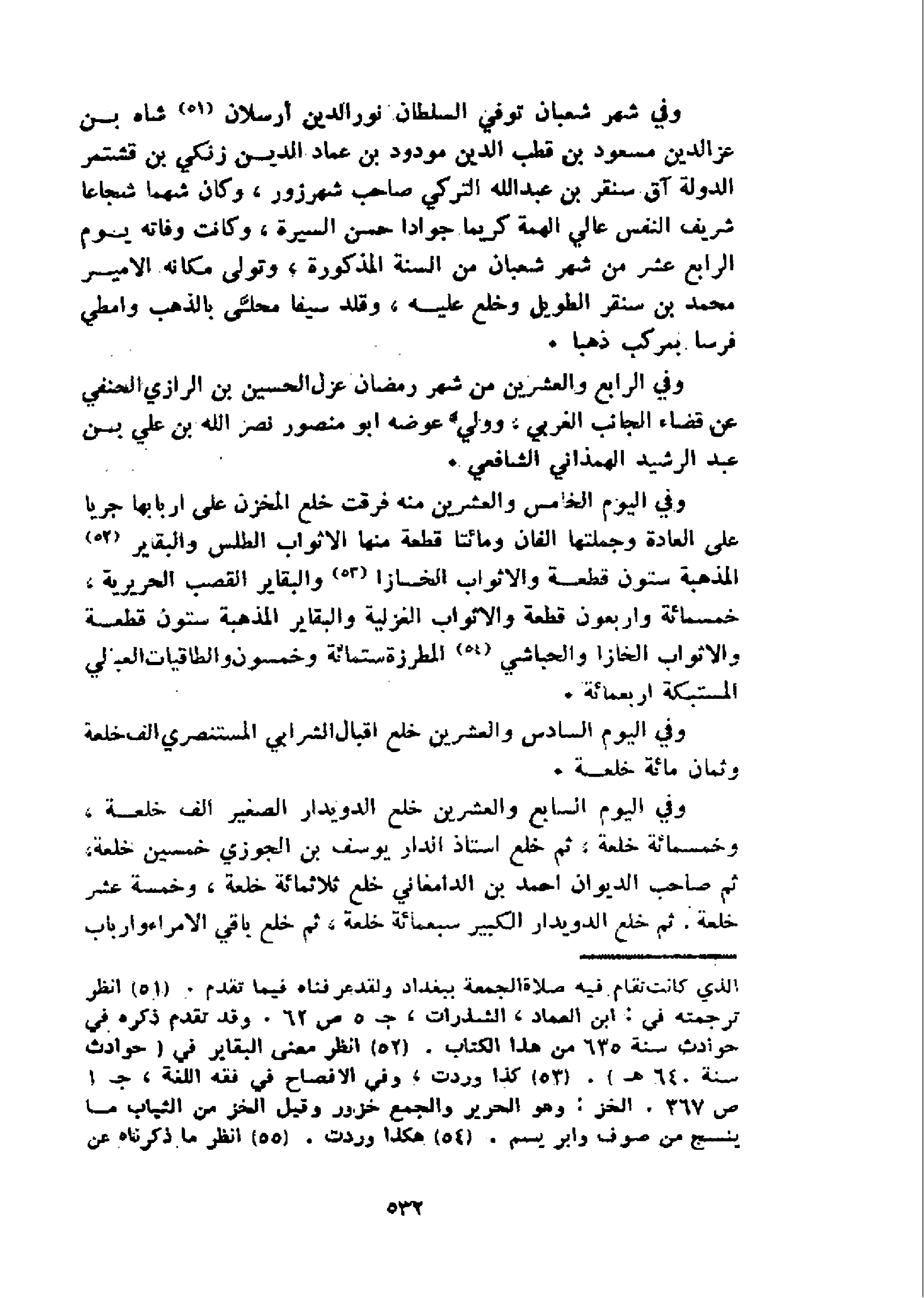 وفي شهر شعبان توفي السلطان نور الدين أرسلان 51 شاه بن عز الدين مسعود بن قطب الدين مودود بن عماد الدين زنكي بن قشتمر الدولة آق سنقر بن عبد الله التركي صاحب شهرزور، وكان شهما شجاعا شريف النفس عالي الهمة كريما جوادا حسن السيرة، وكانت وفاته يوم الرابع عشر من شهر شعبان من السنة المذكورة، وتولى مكانه الامير محمد بن سنقر الطويل وخلع عليه، وقلد سيفا محلّى بالذهب وامطي فرسا بمركب ذهبا.