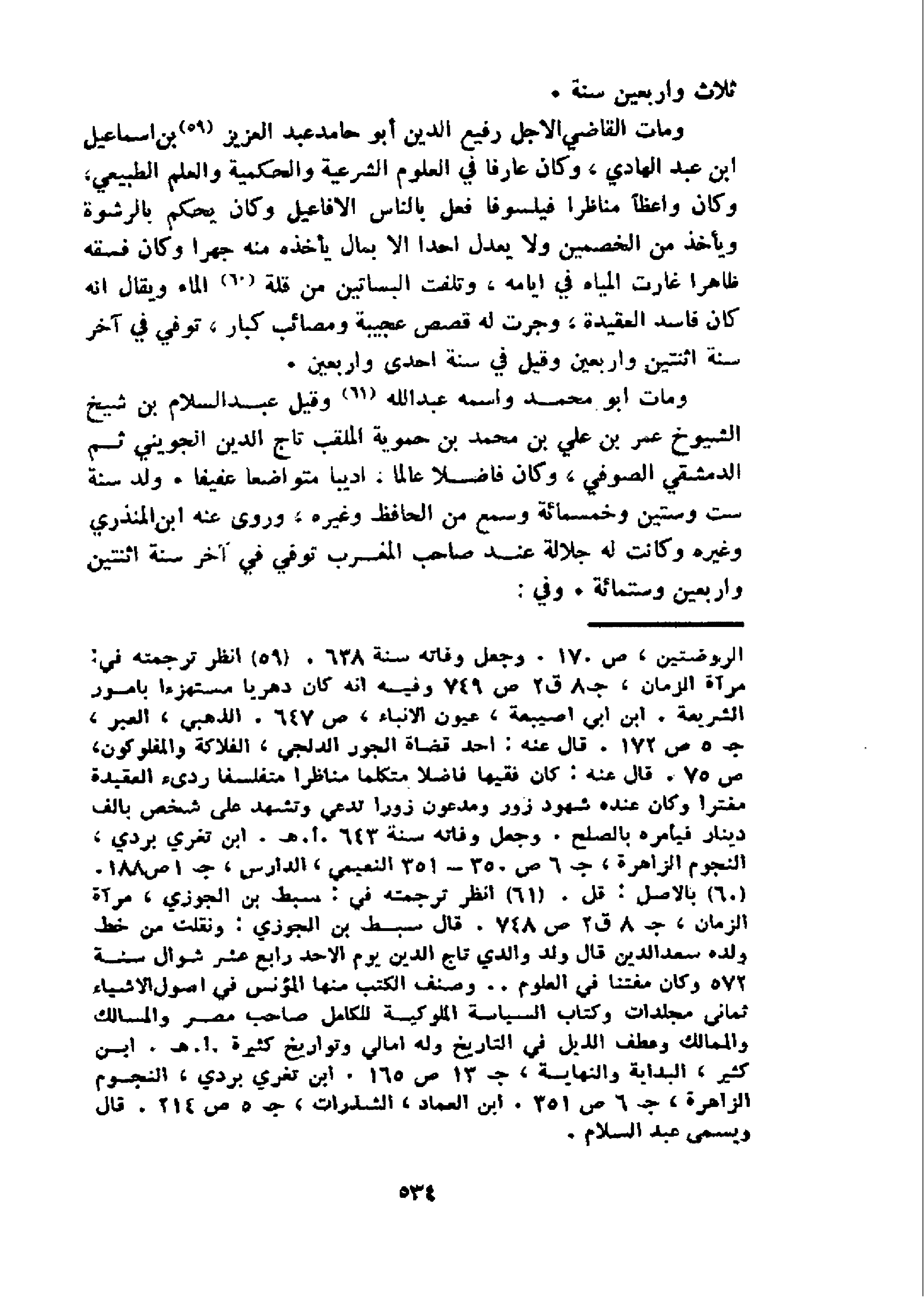 و مات القاضي الاجل رفيع الدين أبو حامد عبد العزيز 59 بن اسماعيل ابن عبد الهادي، وكان عارفا في العلوم الشرعية والحكمية والعلم الطبيعي، وكان واعظا مناظرا فيلسوفا فعل بالناس الافاعيل وكان يحكم بالرشوة ويأخذ من الخصمين ولا يعدل احدا الا بمال يأخذه منه جهرا وكان فسقه ظاهرا غارت المياه في ايامه، وتلفت البساتين من قلة 60 الماء ويقال انه كان فاسد العقيدة، وجرت له قصص عجيبة ومصائب كبار، توفي في آخر سنة اثنتين واربعين وقيل في سنة احدى واربعين.