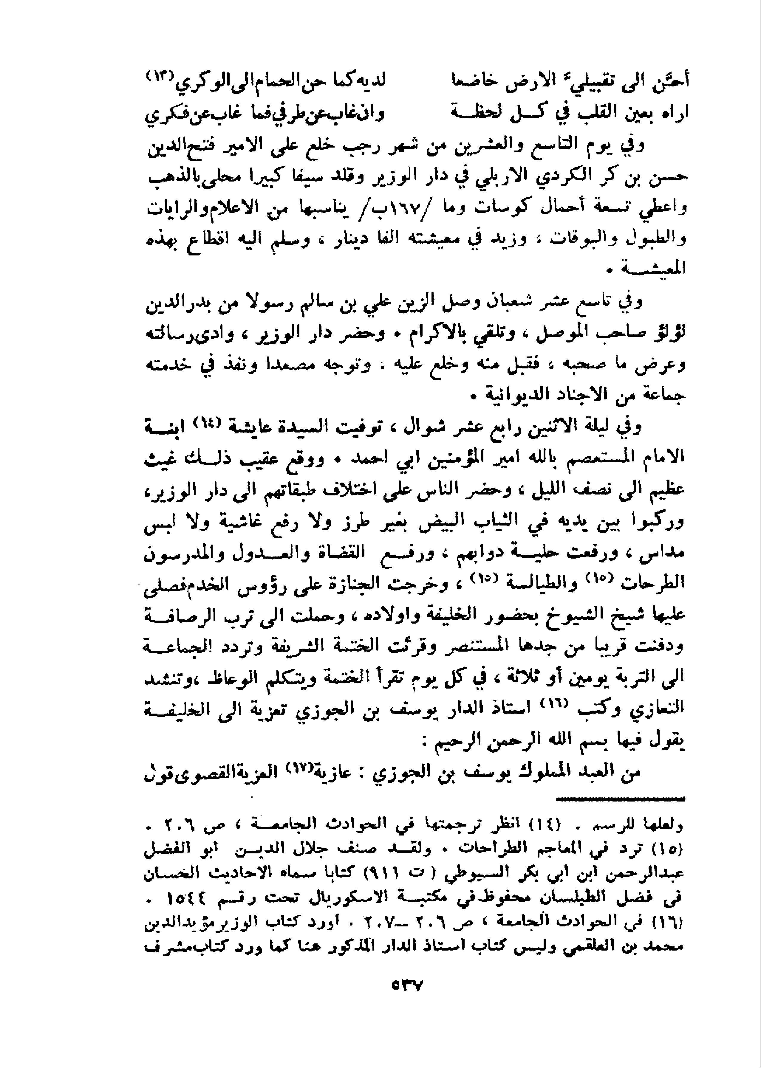 و في ليلة الاثنين رابع عشر شوال، توفيت السيدة عايشة 14 ابنة الامام المستعصم بالله امير المؤمنين ابي احمد. ووقع عقيب ذلك غيث عظيم الى نصف الليل، وحضر الناس على اختلاف طبقاتهم الى دار الوزير، وركبوا بين يديه في الثياب البيض بغير طرز ولا رفع غاشية ولا لبس مداس، ورفعت حلية دوابهم، ورفع القضاة والعدول والمدرسون الطرحات 15 و الطيالسة 15، و خرجت الجنازة على رؤوس الخدم فصلى عليها شيخ الشيوخ بحضور الخليفة واولاده، وحملت الى ترب الرصافة ودفنت قريبا من جدها المستنصر وقرئت الختمة الشريفة وتردد الجماعة الى التربة يومين أو ثلاثة، في كل يوم تقرأ الختمة ويتكلم الوعاظ، وتنشد التعازي وكتب 16 استاذ الدار يوسف بن الجوزي تعزية الى الخليفة يقول فيها بسم الله الرحمن الرحيم:
