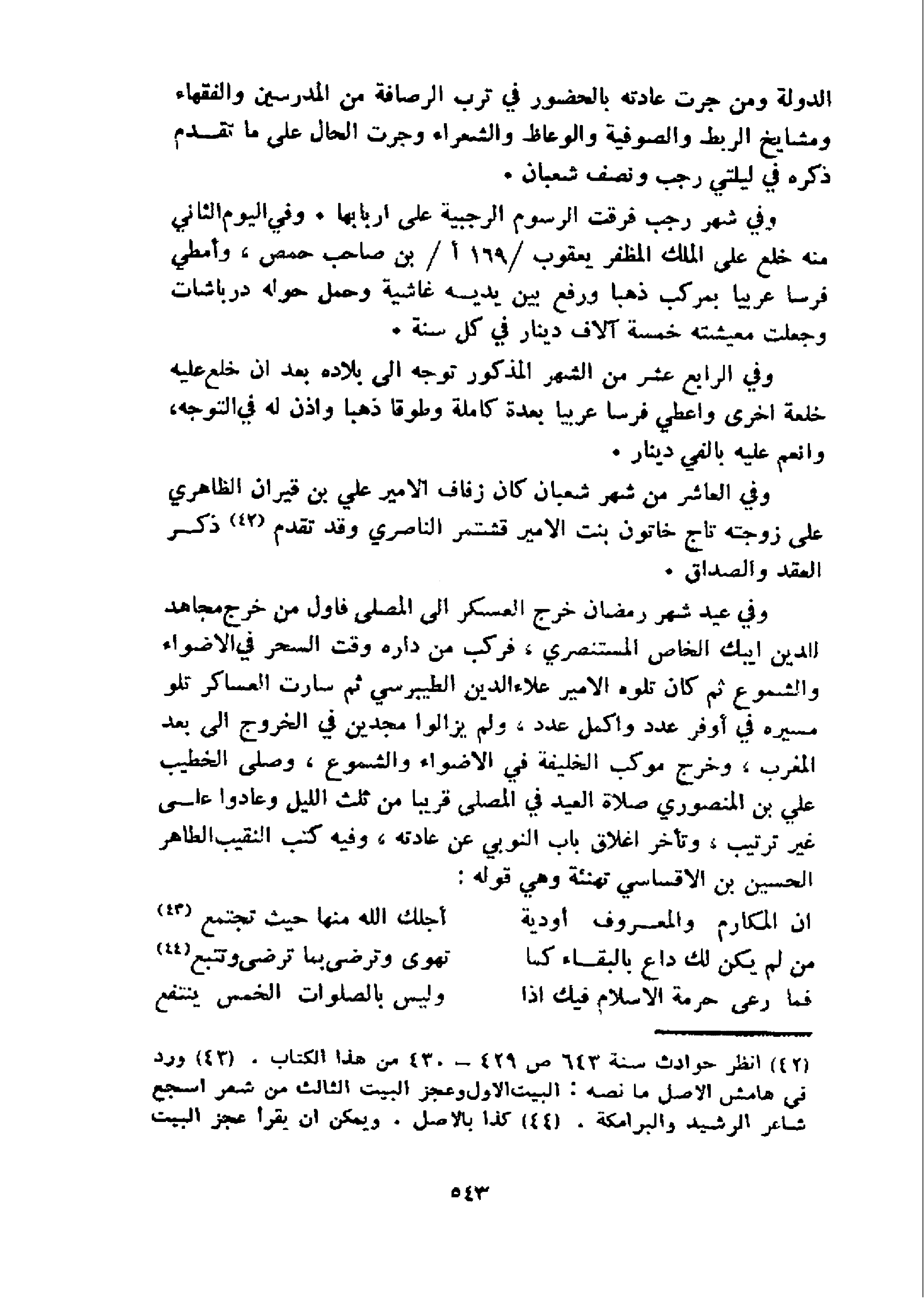 و في عيد شهر رمضان خرج العسكر الى المصلى فاول من خرج مجاهد للدين ايبك الخاص المستنصري، فركب من داره وقت السحر في الاضواء والشموع ثم كان تلوه الامير علاء الدين الطيبرسي ثم سارت العساكر تلو مسيره في أوفر عدد واكمل عدد، ولم يزالوا مجدين في الخروج الى بعد المغرب، وخرج موكب الخليفة في الاضواء والشموع، وصلى الخطيب علي بن المنصوري صلاة العيد في المصلى قريبا من ثلث الليل وعادوا على غير ترتيب، وتأخر اغلاق باب النوبي عن عادته، وفيه كتب النقيب الطاهر الحسين بن الاقساسي تهنئة وهي قوله: